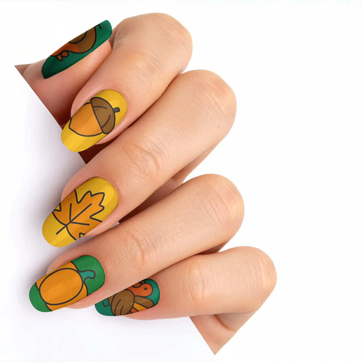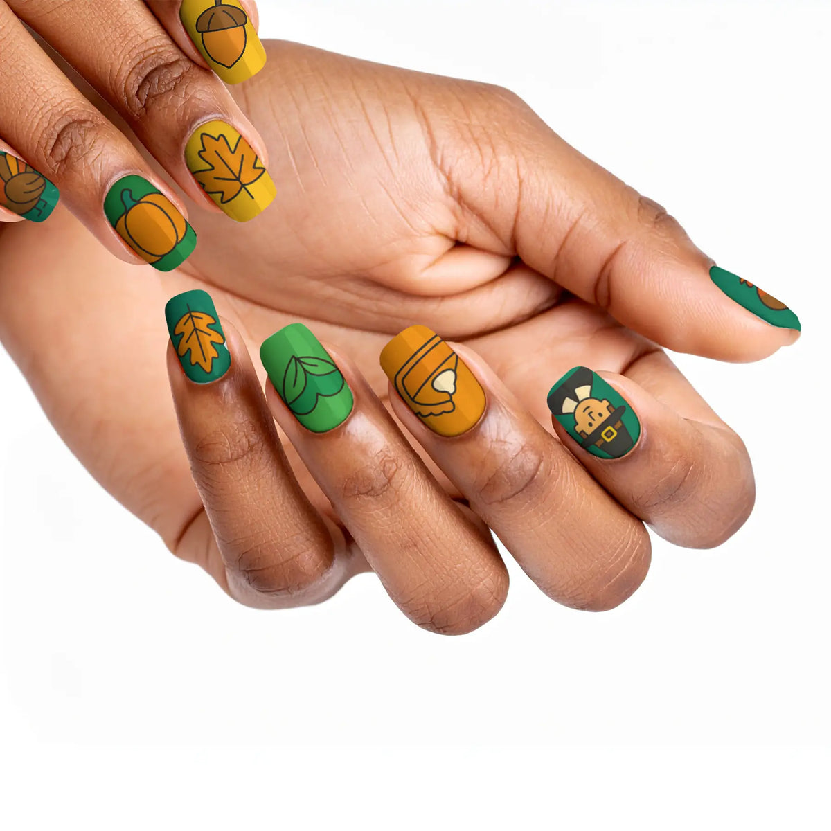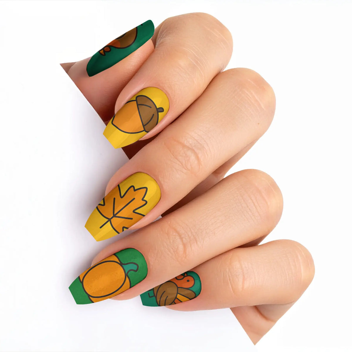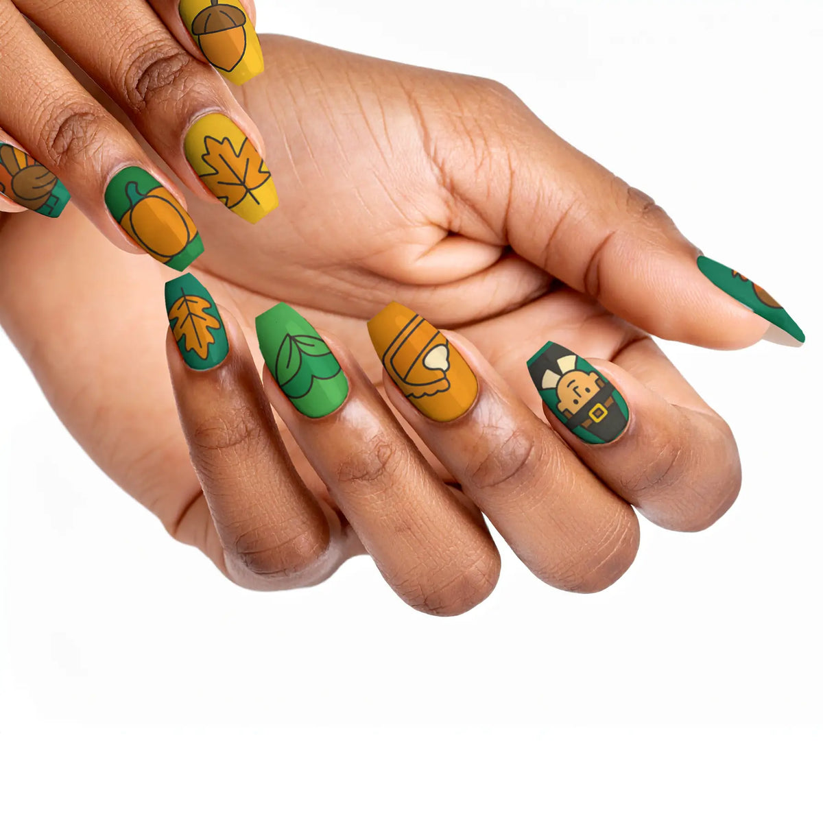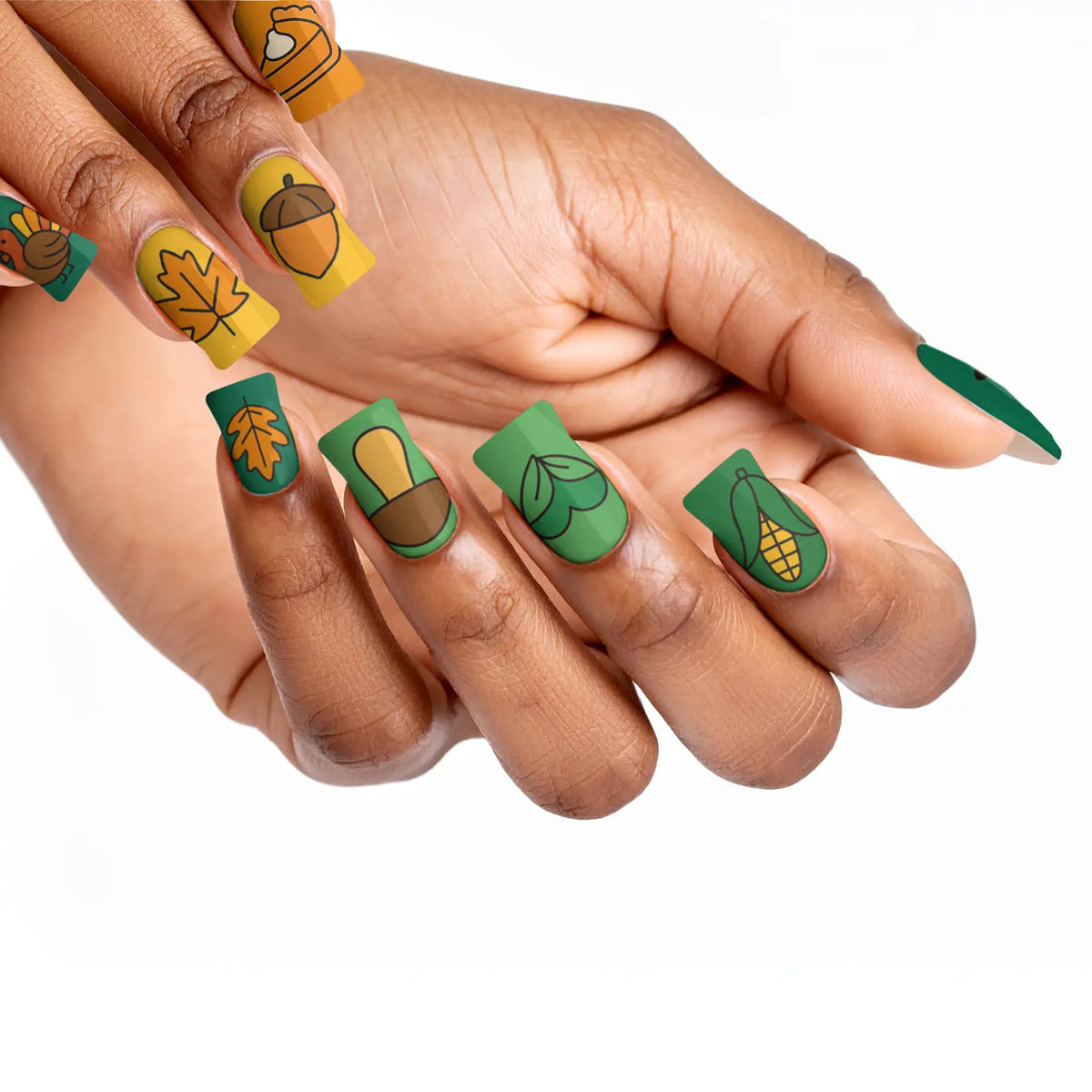 Elevate your style this season with our Autumn Green Glow Thanksgiving Press-On Nails, a lush collection that transforms your fingertips into a masterpiece. Inspired by the vibrant hues of fall, this set captures nature's opulence in a striking green palette. Perfect for festive gatherings or anytime you want to make a statement, each nail design is crafted to reflect sophistication and celebration. Enjoy salon-quality results from the comfort of your home, and let your nails speak elegance for any occasion.