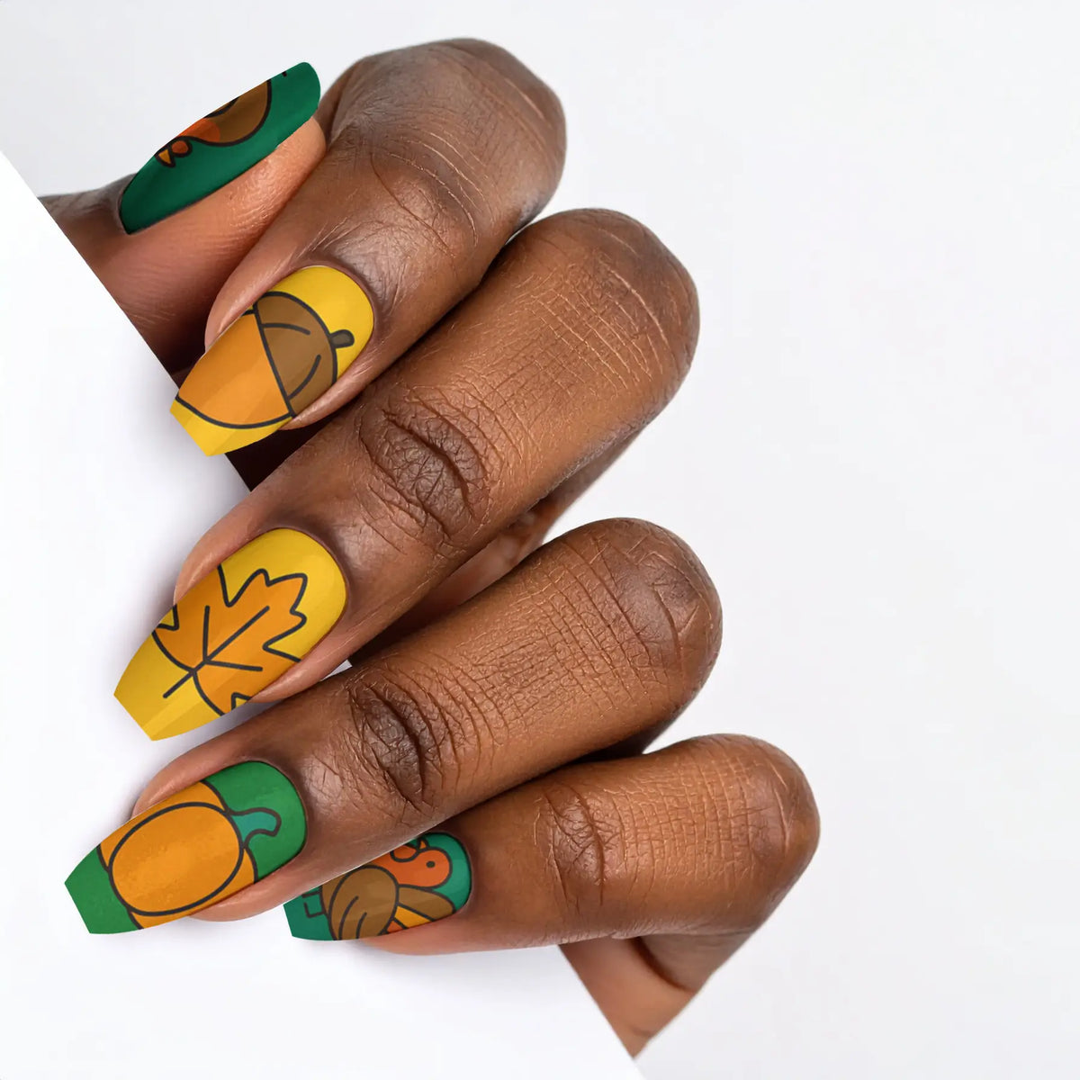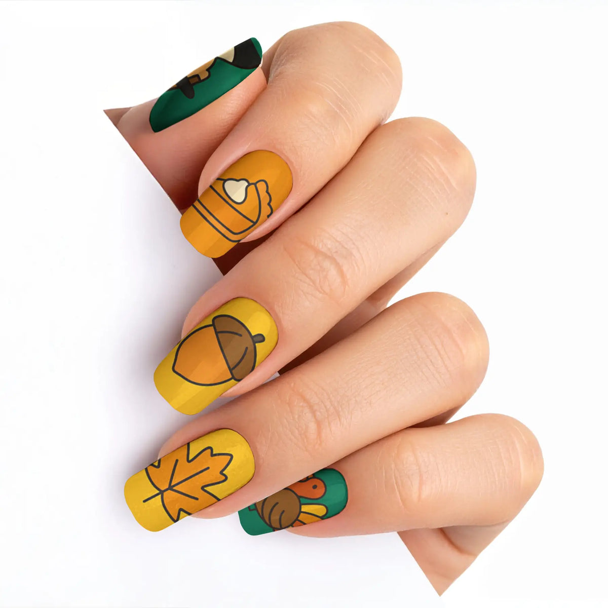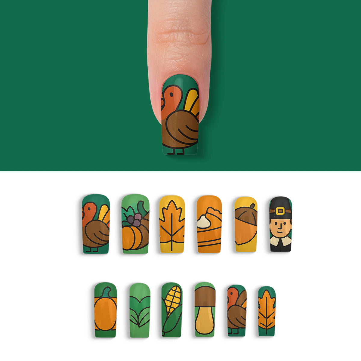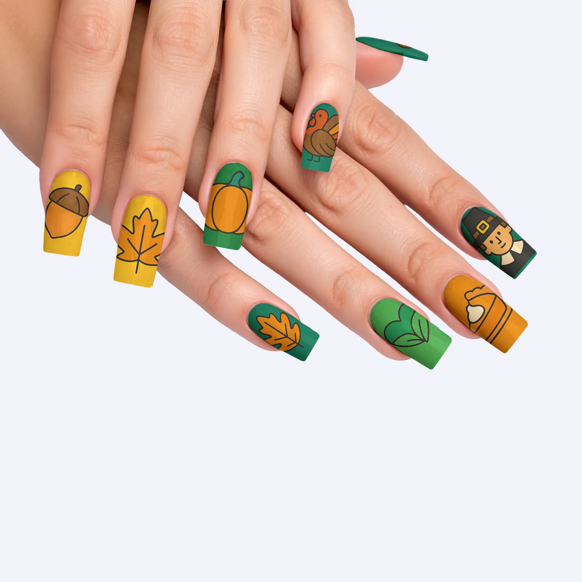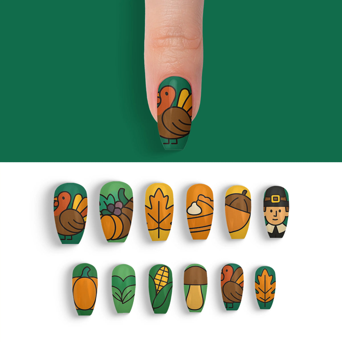 Elevate your style this season with our Autumn Green Glow Thanksgiving Press-On Nails, a lush collection that transforms your fingertips into a masterpiece. Inspired by the vibrant hues of fall, this set captures nature's opulence in a striking green palette. Perfect for festive gatherings or anytime you want to make a statement, each nail design is crafted to reflect sophistication and celebration. Enjoy salon-quality results from the comfort of your home, and let your nails speak elegance for any occasion.