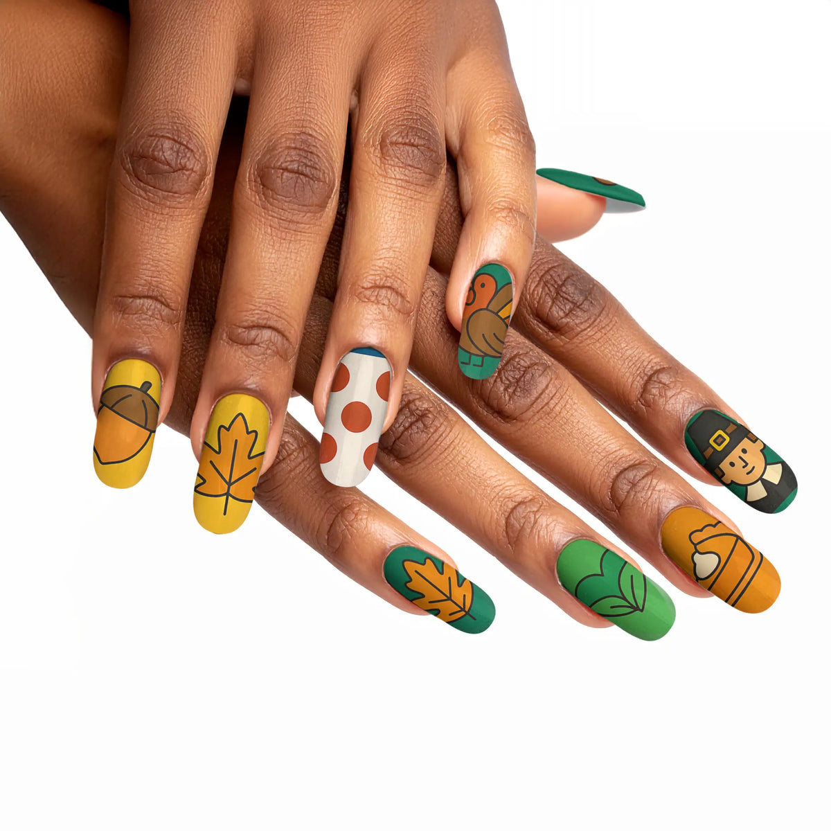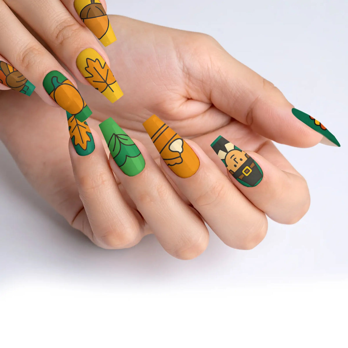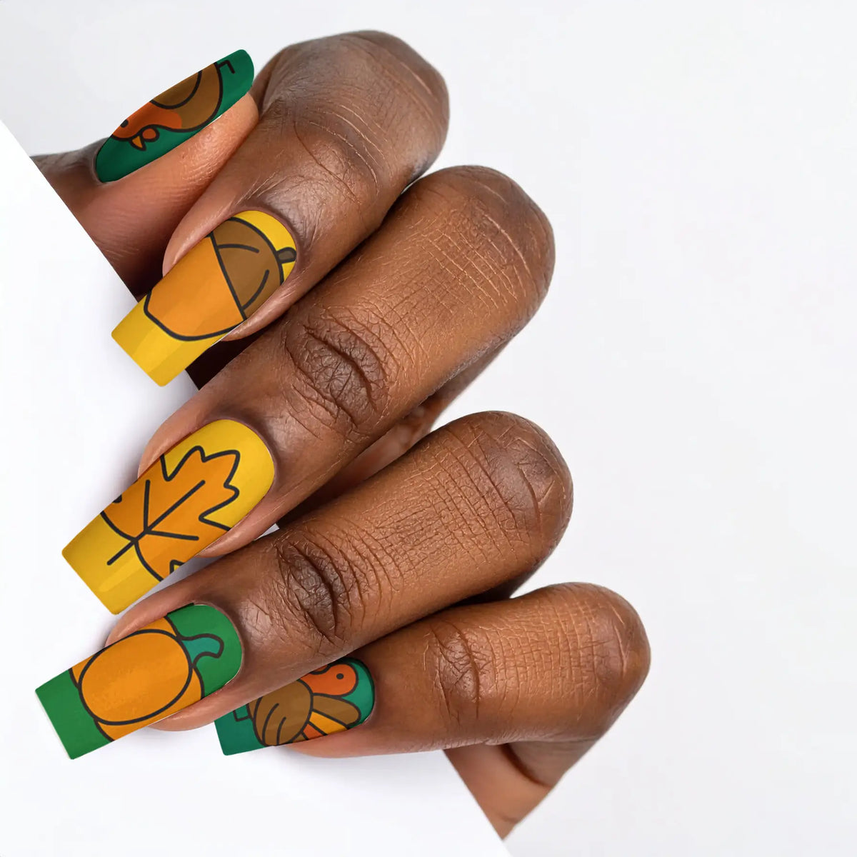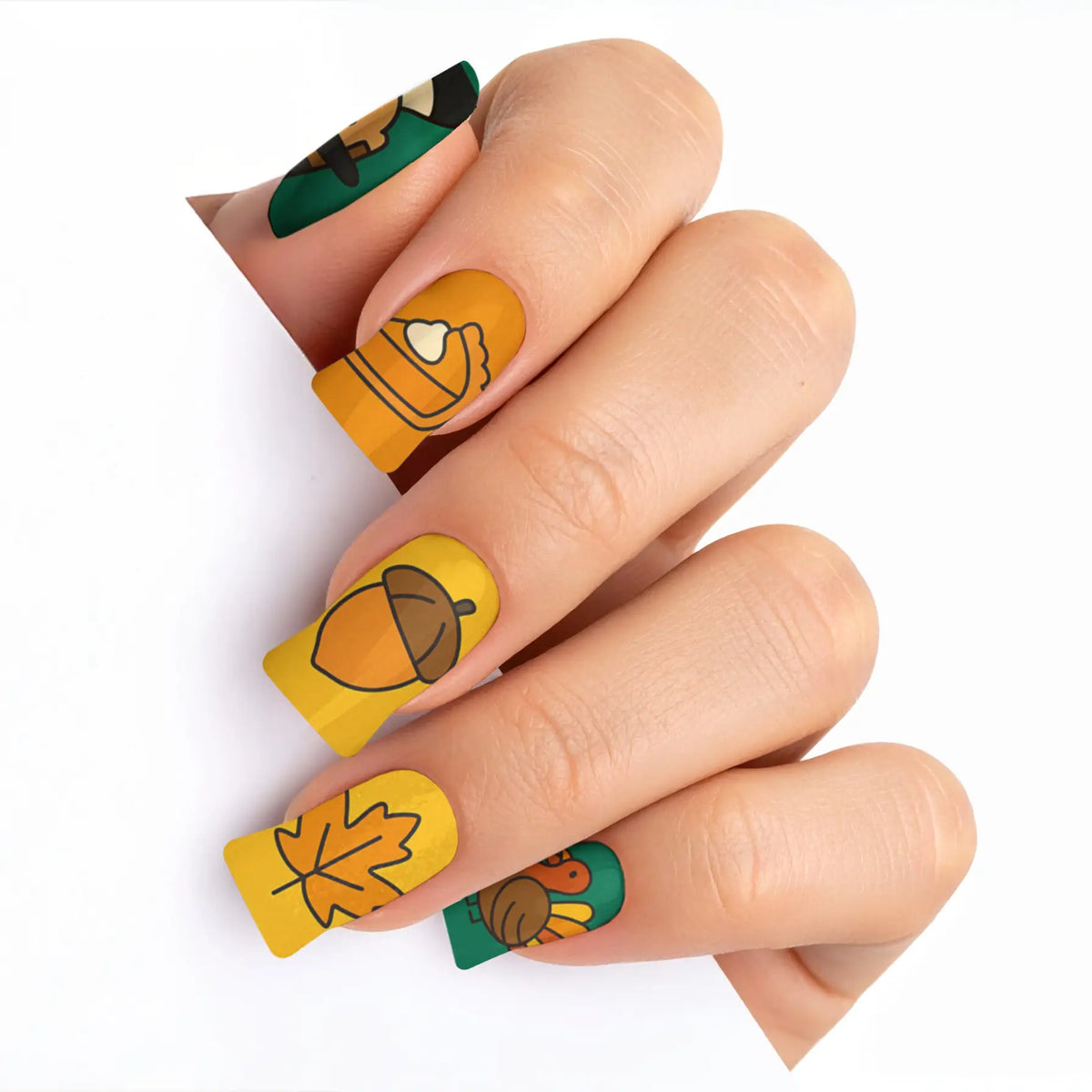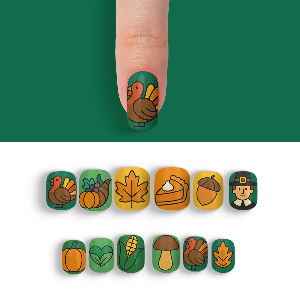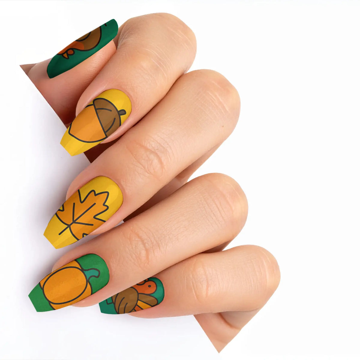 Elevate your style this season with our Autumn Green Glow Thanksgiving Press-On Nails, a lush collection that transforms your fingertips into a masterpiece. Inspired by the vibrant hues of fall, this set captures nature's opulence in a striking green palette. Perfect for festive gatherings or anytime you want to make a statement, each nail design is crafted to reflect sophistication and celebration. Enjoy salon-quality results from the comfort of your home, and let your nails speak elegance for any occasion.