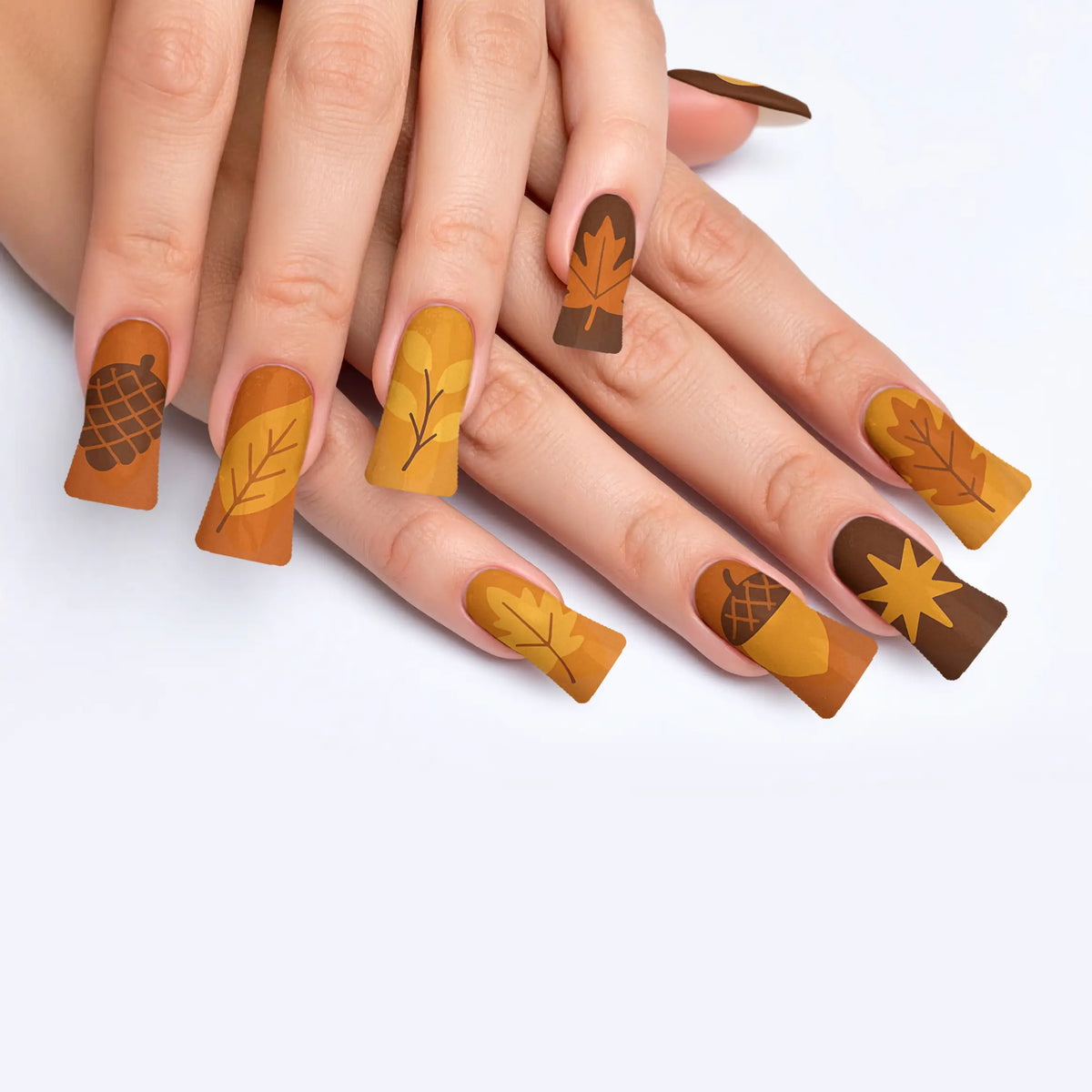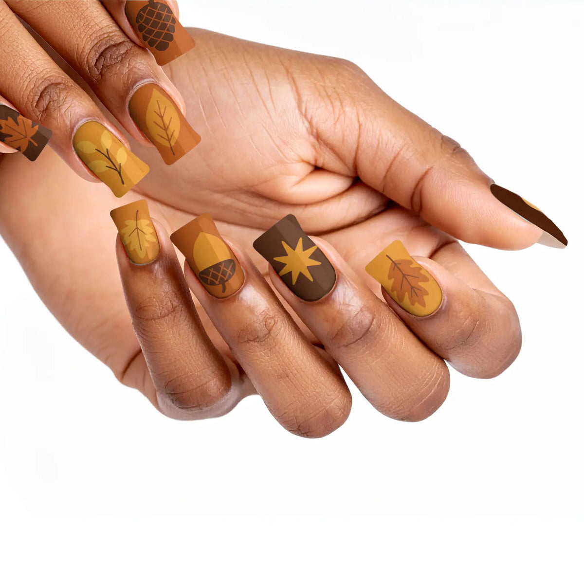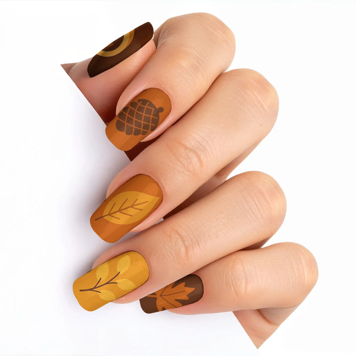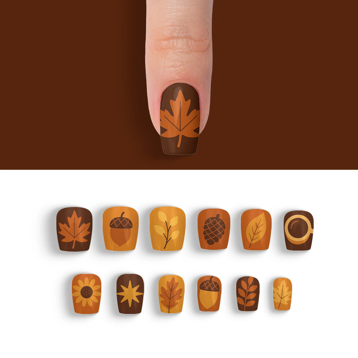 Embrace the beauty of fall with our Autumn Leaf Luxe Brown Elegance Press-On Nails, designed to transform your fingertips into stunning seasonal masterpieces. Each set draws inspiration from the rich, warm tones of autumn, capturing the essence of falling leaves in an array of beautiful brown shades. These luxurious designs offer a stylish and sophisticated look, perfect for any occasion this season. Effortlessly elevate your nail game with this reusable and durable set, allowing you to enjoy salon-quality nails that last.