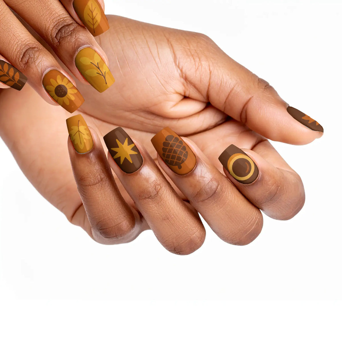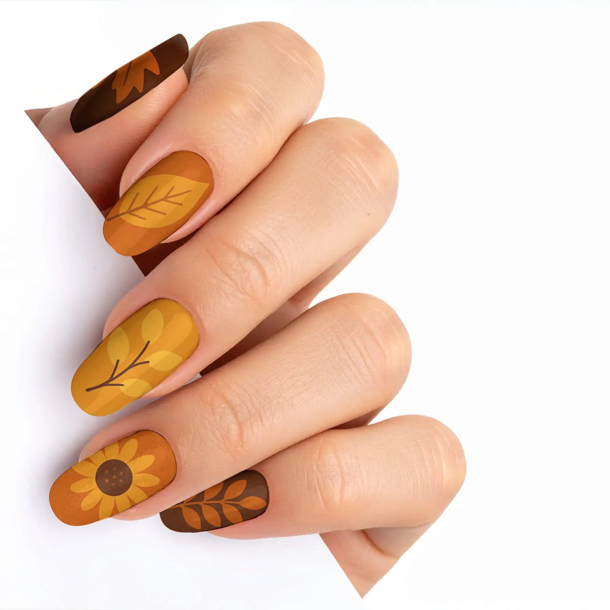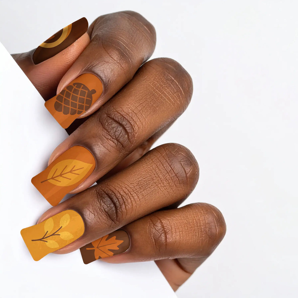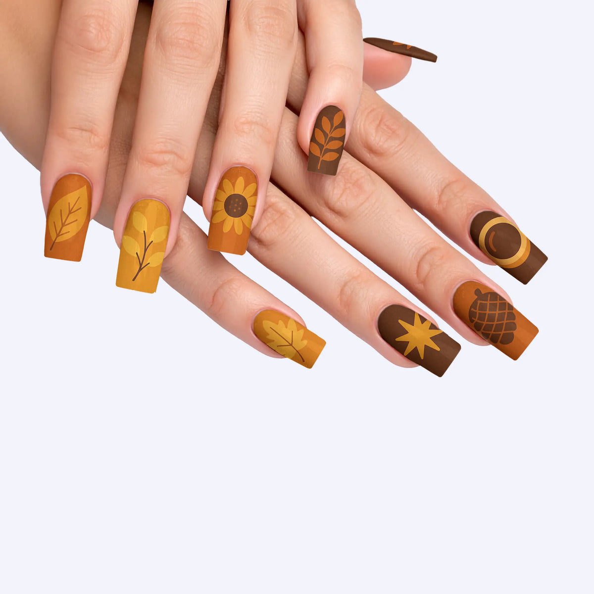 Embrace the beauty of fall with our Autumn Leaf Luxe Brown Elegance Press-On Nails, designed to transform your fingertips into stunning seasonal masterpieces. Each set draws inspiration from the rich, warm tones of autumn, capturing the essence of falling leaves in an array of beautiful brown shades. These luxurious designs offer a stylish and sophisticated look, perfect for any occasion this season. Effortlessly elevate your nail game with this reusable and durable set, allowing you to enjoy salon-quality nails that last.