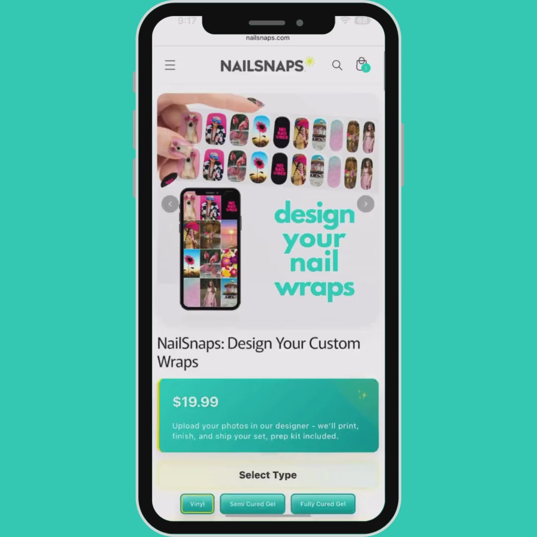 Upload your images & artwork. Arrange art across each nail; adjust scale, crop, and rotate. Add some text or stickers!