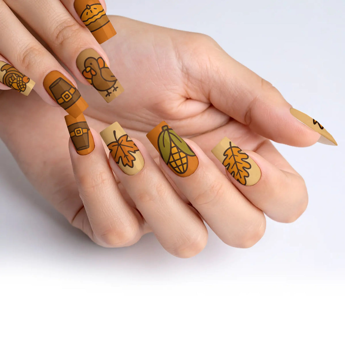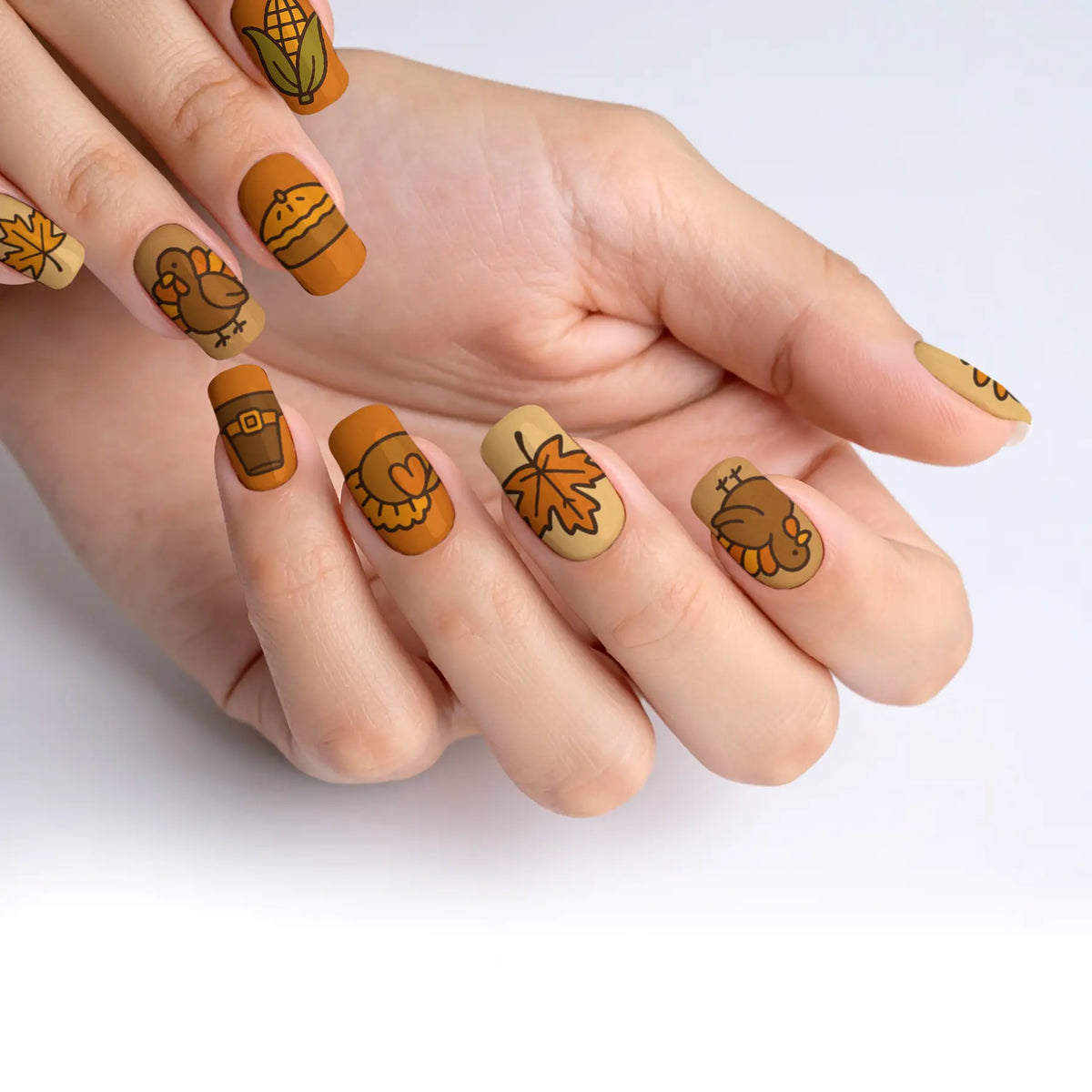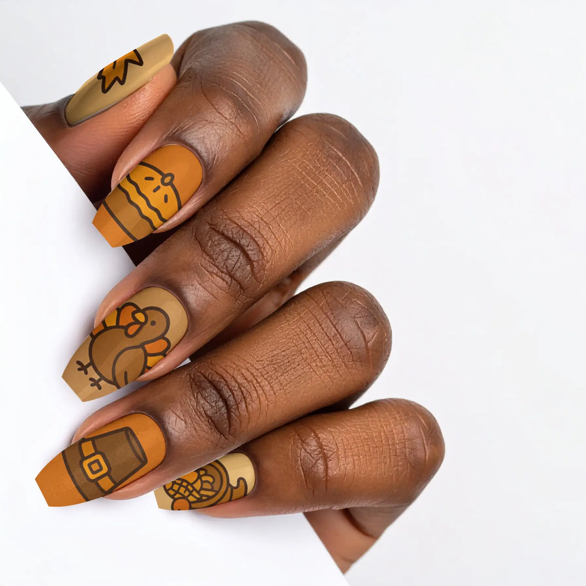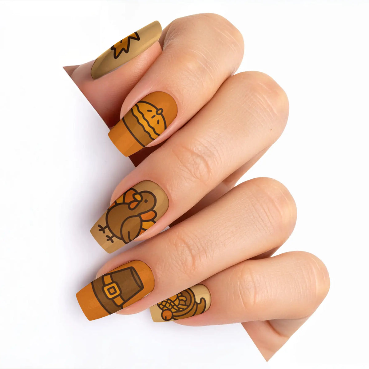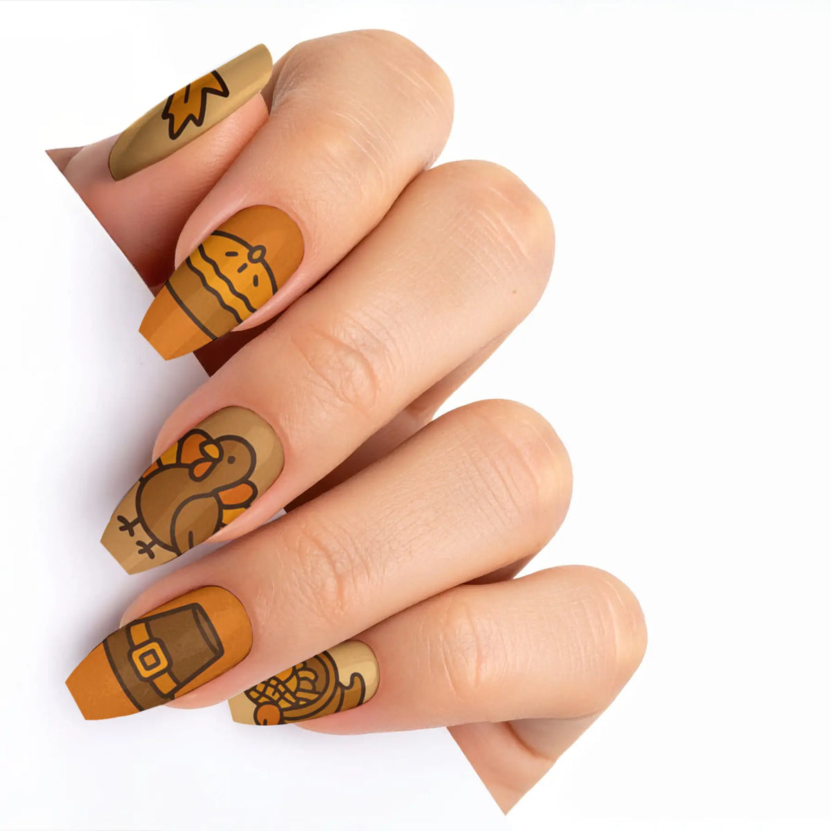 Step into subtle sophistication with our latest press-on nail collection, where classic beige hues beautifully capture the essence of Thanksgiving. These nails showcase a medley of turkey-themed accents paired with chic neutrals, creating a refined, autumn-inspired appearance. Ideal for any festive gathering, enjoy a salon-quality finish and effortless application, all without stepping out of your home. Plus, their robust and reusable designs let you relish the season's charm repeatedly.
