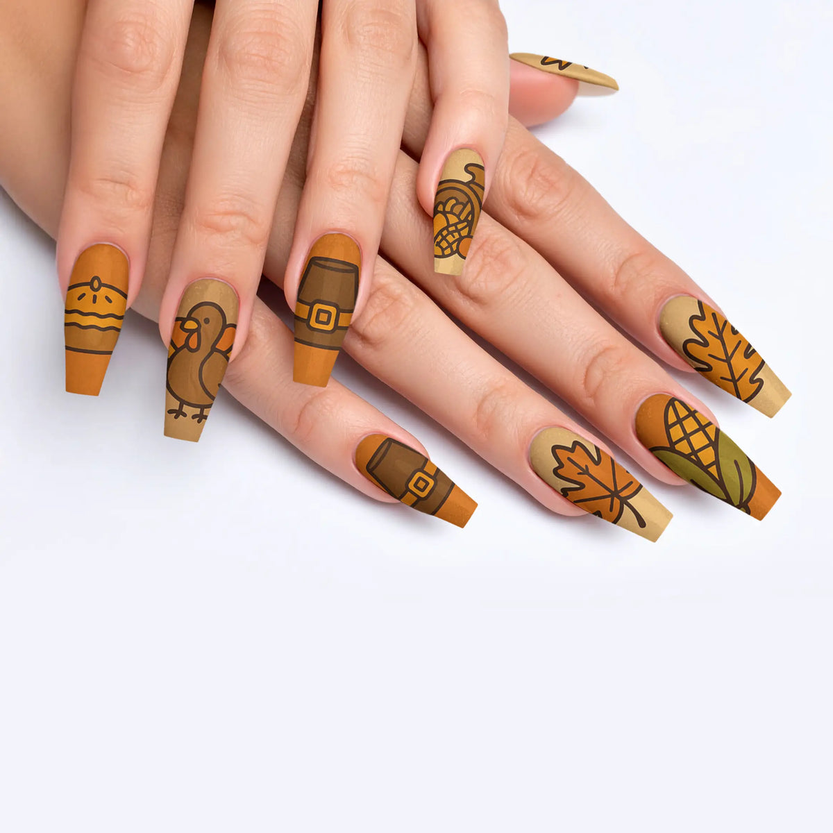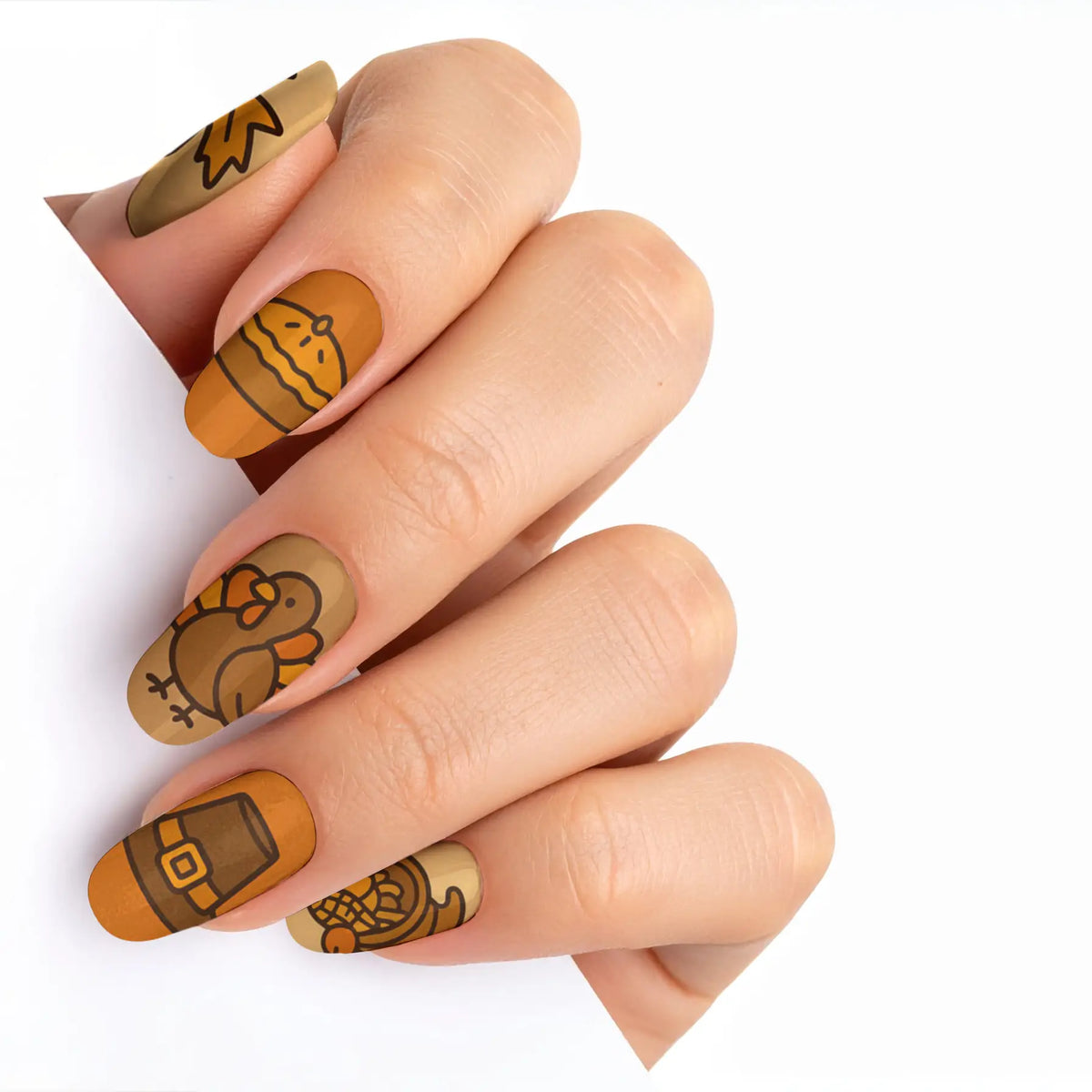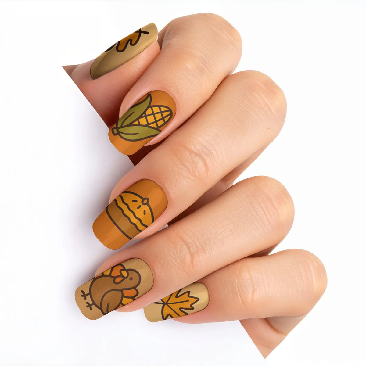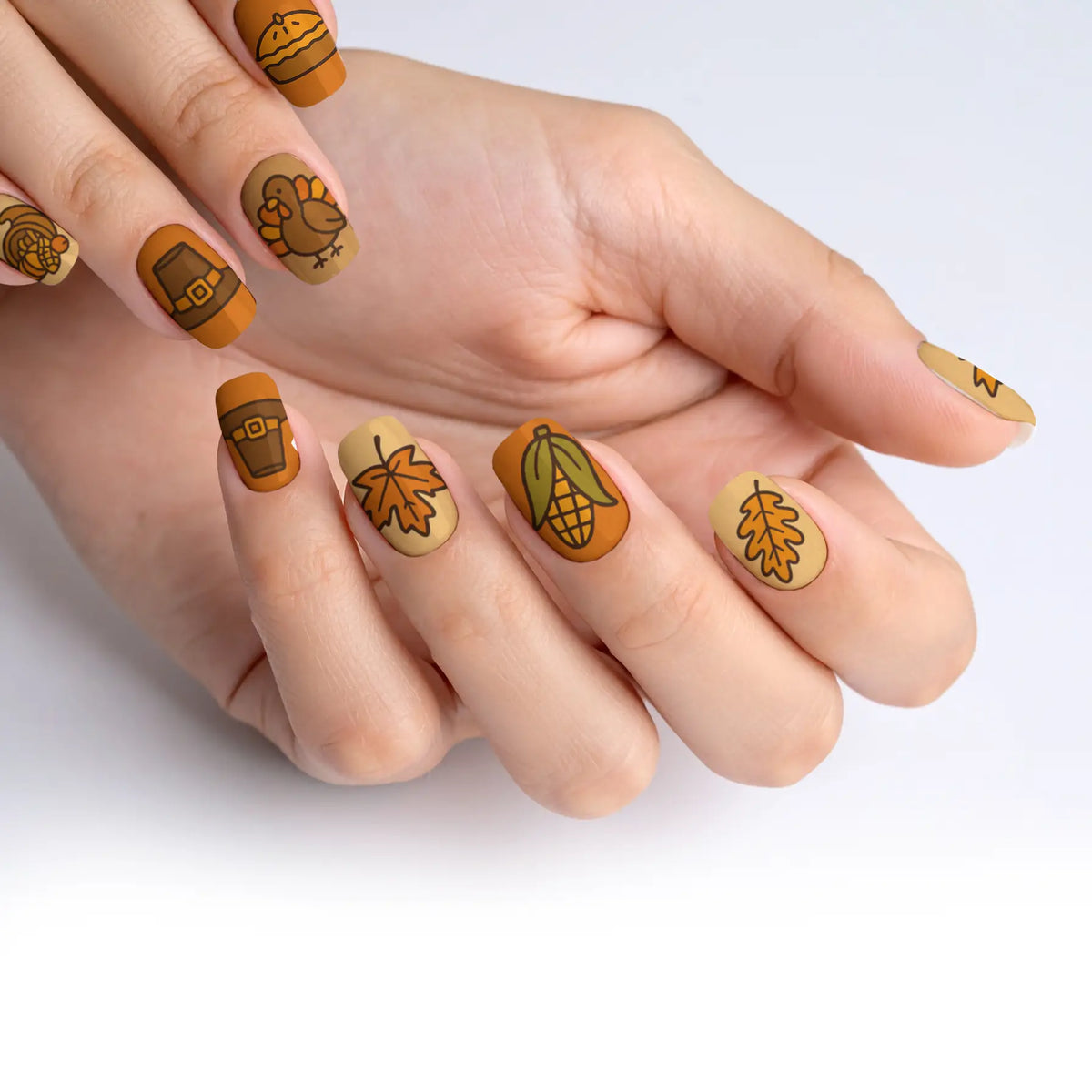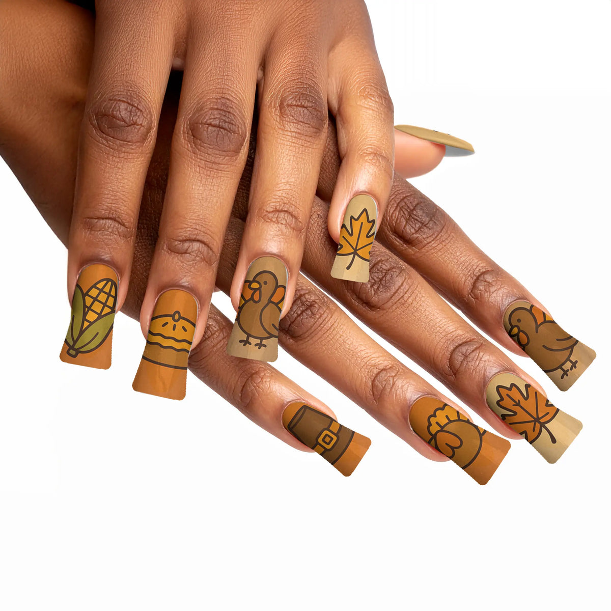 Step into subtle sophistication with our latest press-on nail collection, where classic beige hues beautifully capture the essence of Thanksgiving. These nails showcase a medley of turkey-themed accents paired with chic neutrals, creating a refined, autumn-inspired appearance. Ideal for any festive gathering, enjoy a salon-quality finish and effortless application, all without stepping out of your home. Plus, their robust and reusable designs let you relish the season's charm repeatedly.