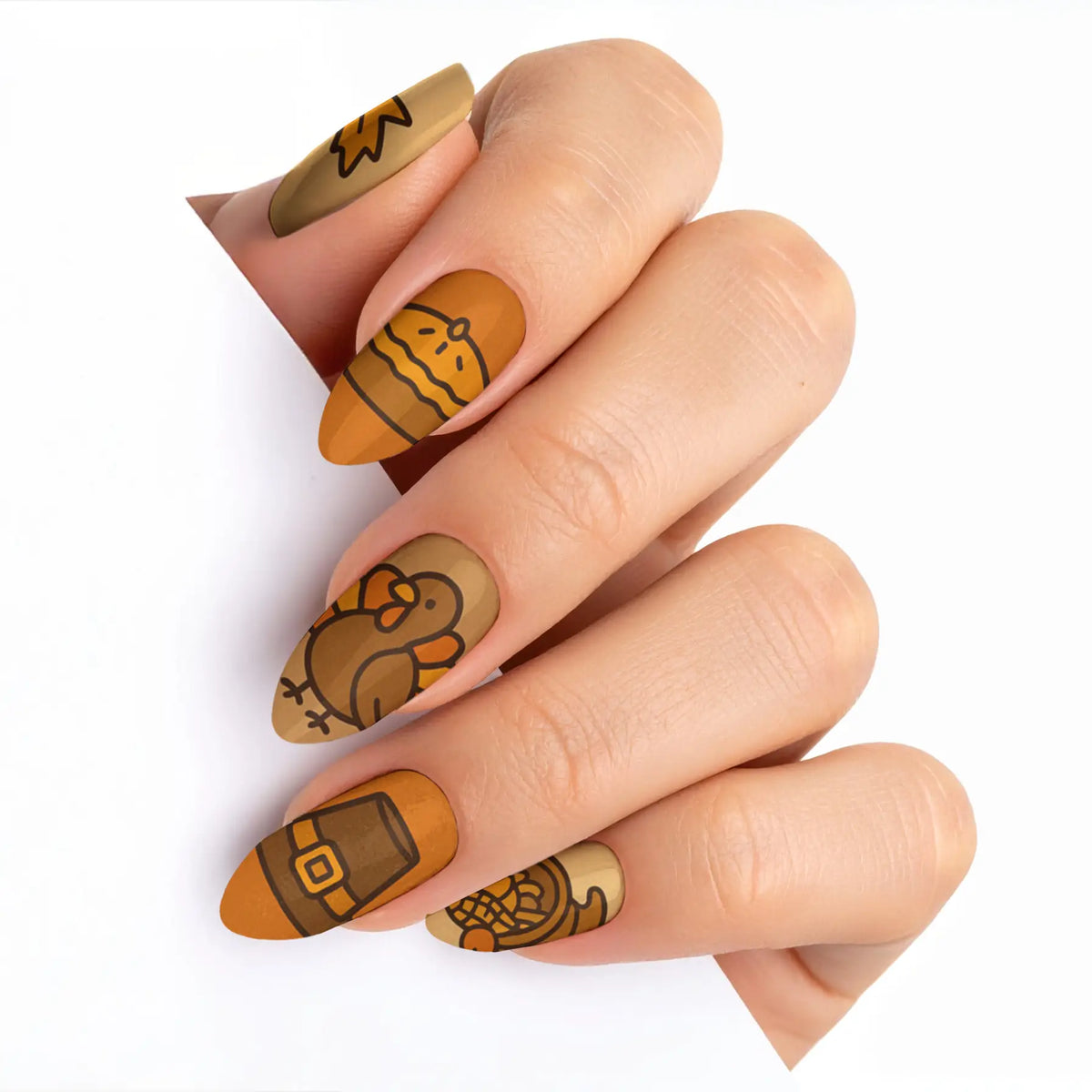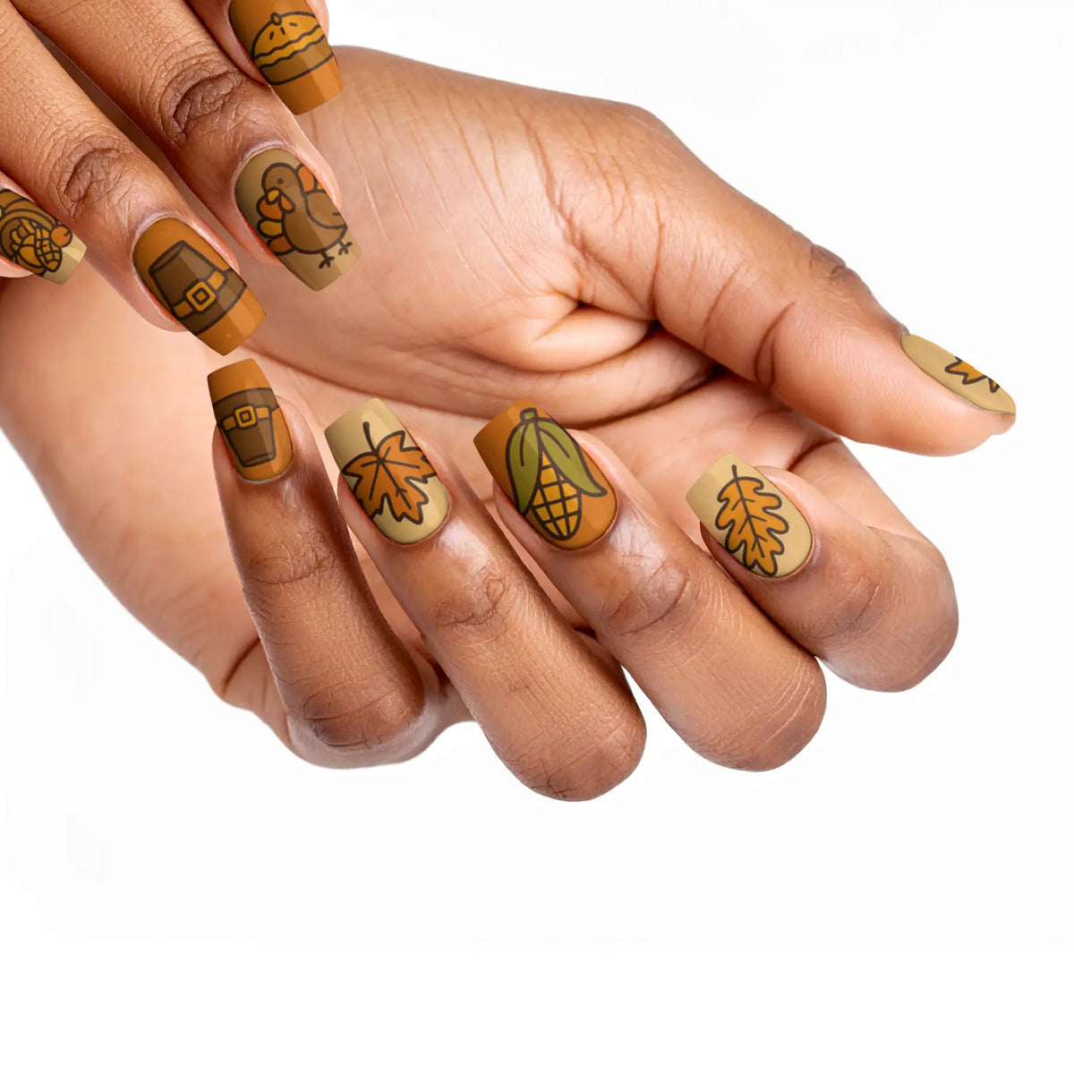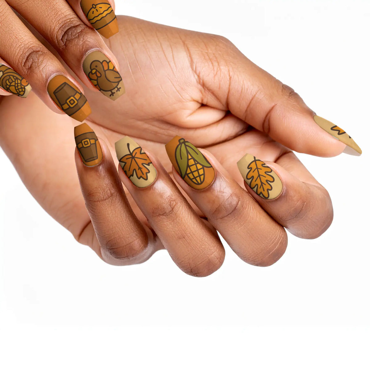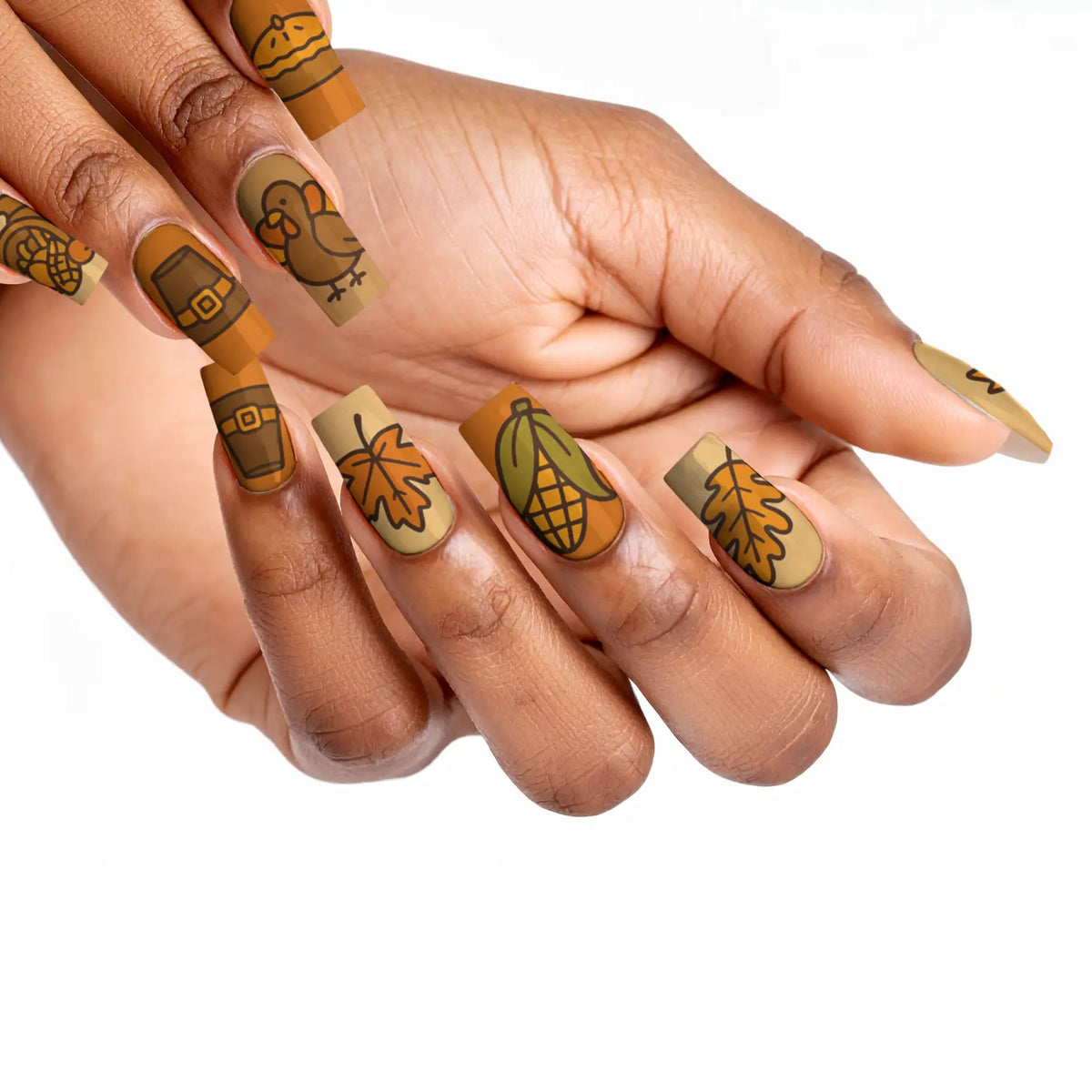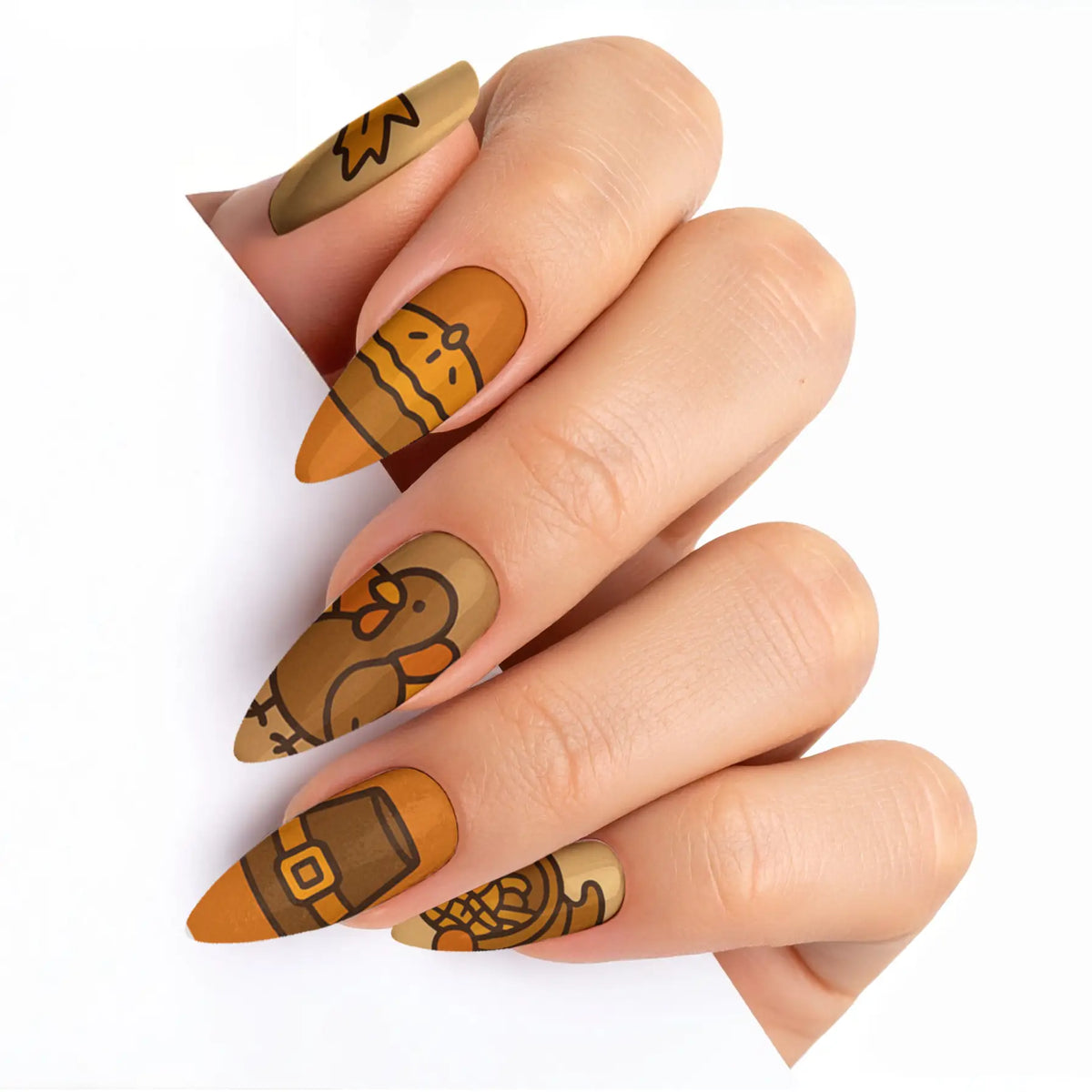Step into subtle sophistication with our latest press-on nail collection, where classic beige hues beautifully capture the essence of Thanksgiving. These nails showcase a medley of turkey-themed accents paired with chic neutrals, creating a refined, autumn-inspired appearance. Ideal for any festive gathering, enjoy a salon-quality finish and effortless application, all without stepping out of your home. Plus, their robust and reusable designs let you relish the season's charm repeatedly.