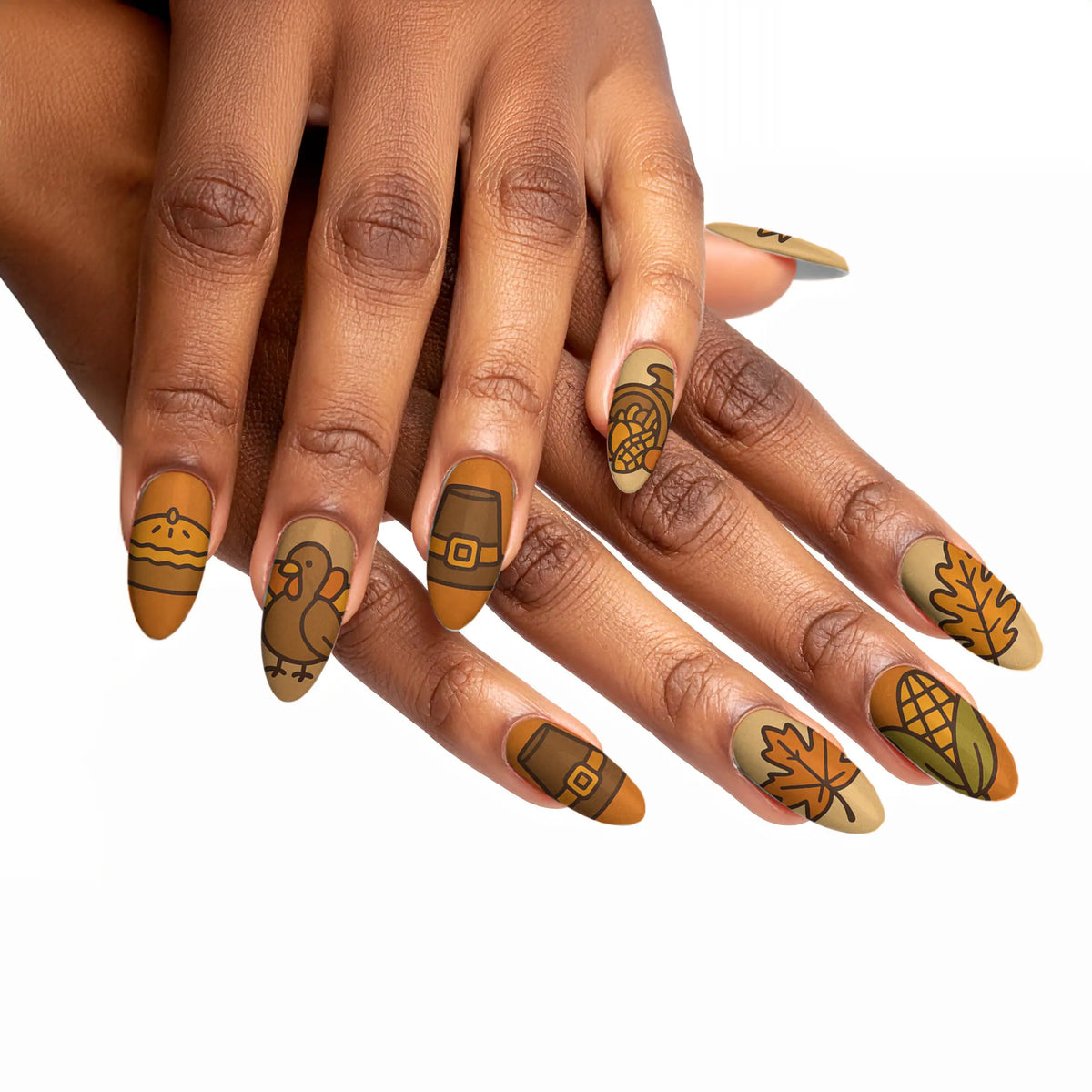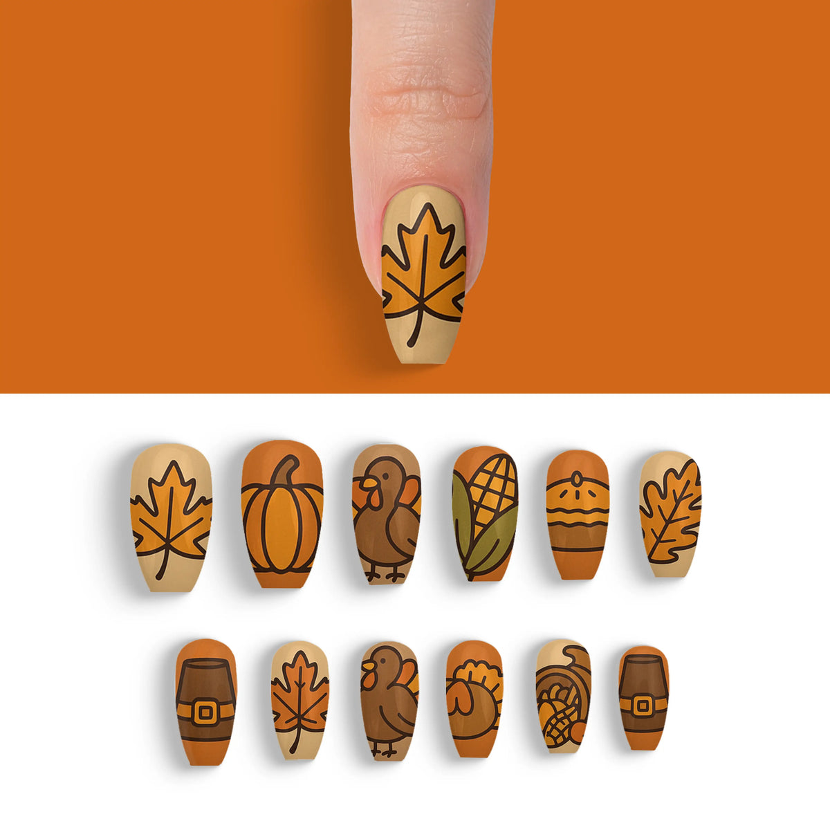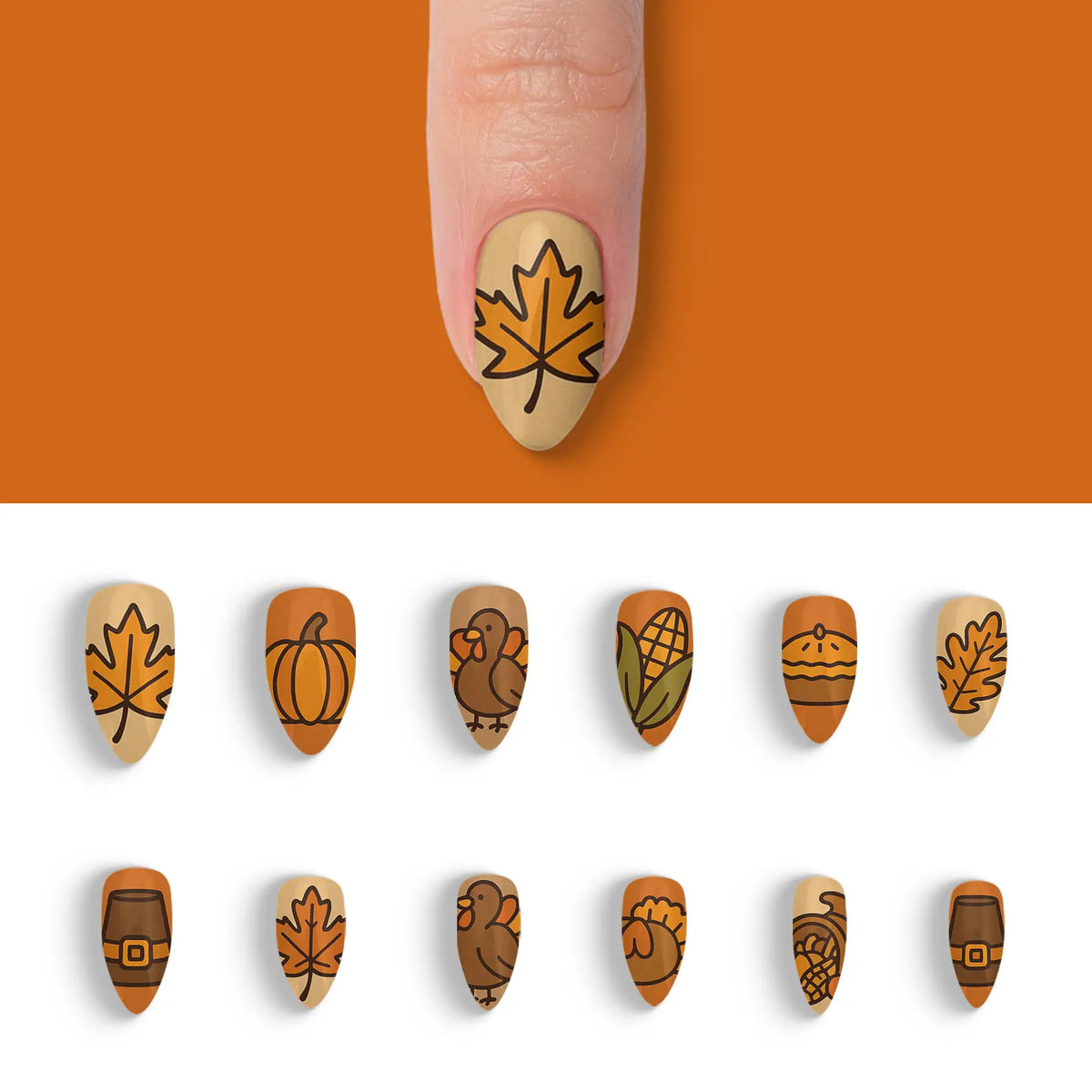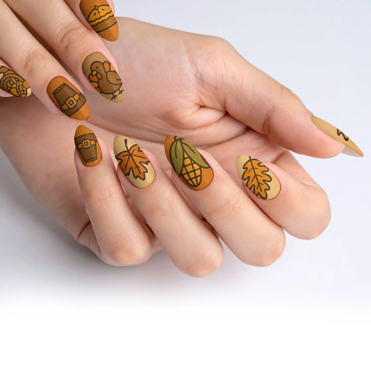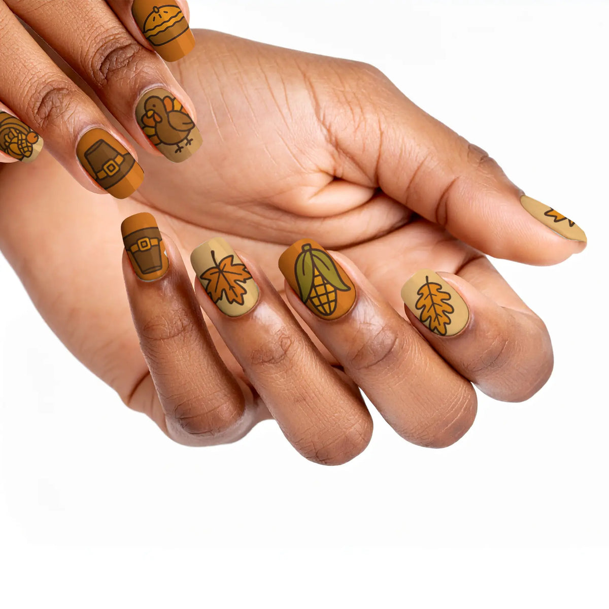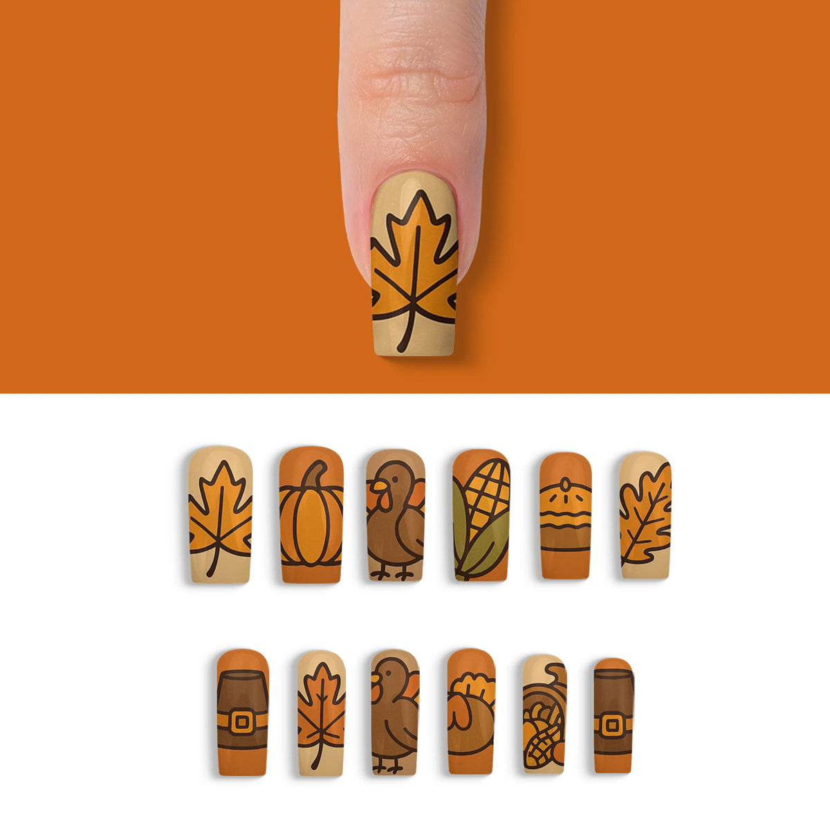 Step into subtle sophistication with our latest press-on nail collection, where classic beige hues beautifully capture the essence of Thanksgiving. These nails showcase a medley of turkey-themed accents paired with chic neutrals, creating a refined, autumn-inspired appearance. Ideal for any festive gathering, enjoy a salon-quality finish and effortless application, all without stepping out of your home. Plus, their robust and reusable designs let you relish the season's charm repeatedly.
