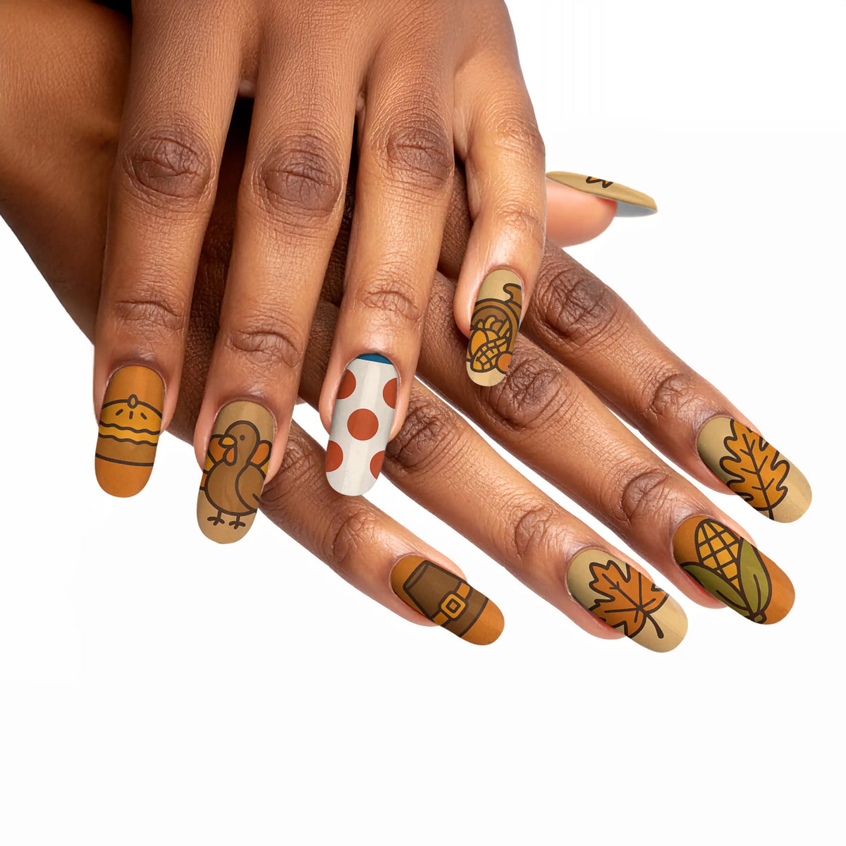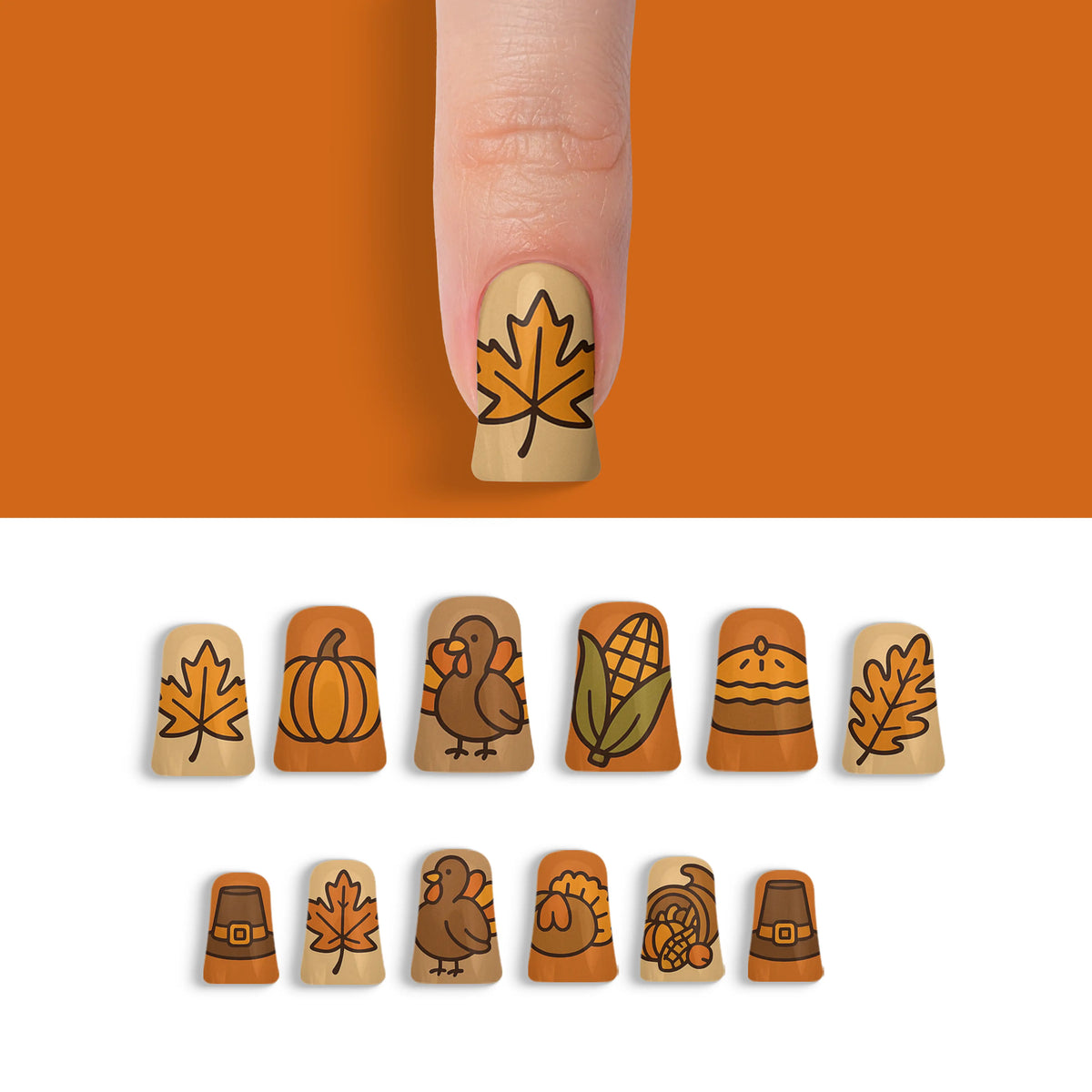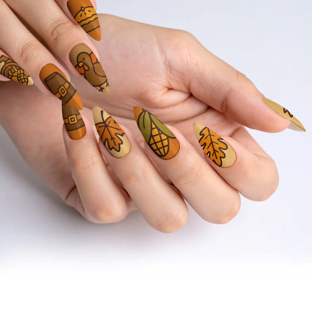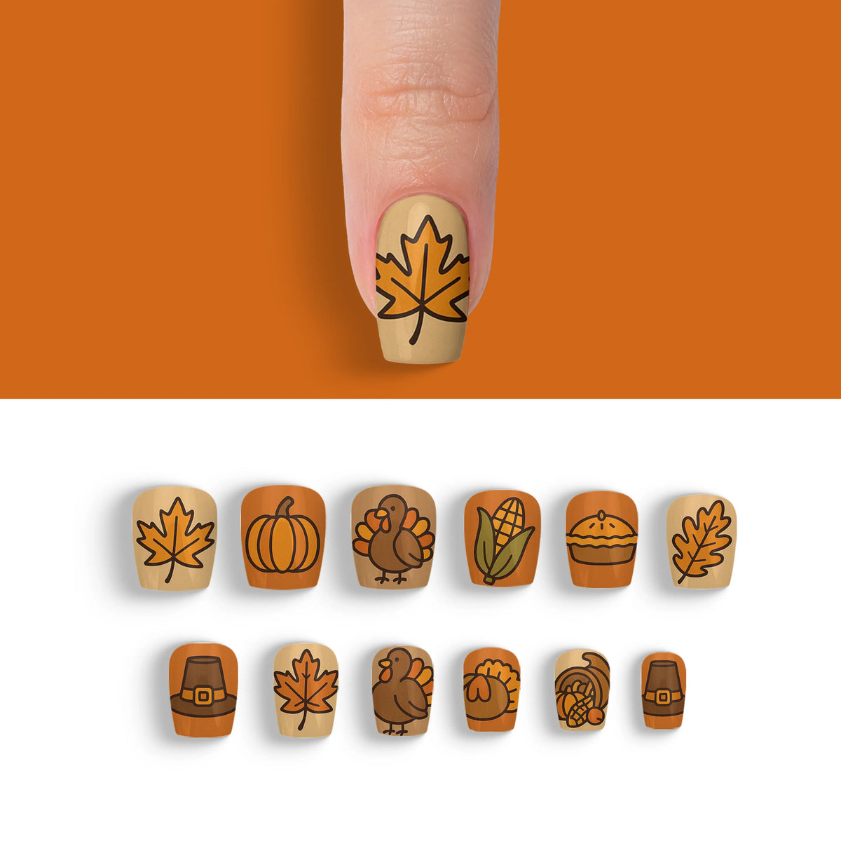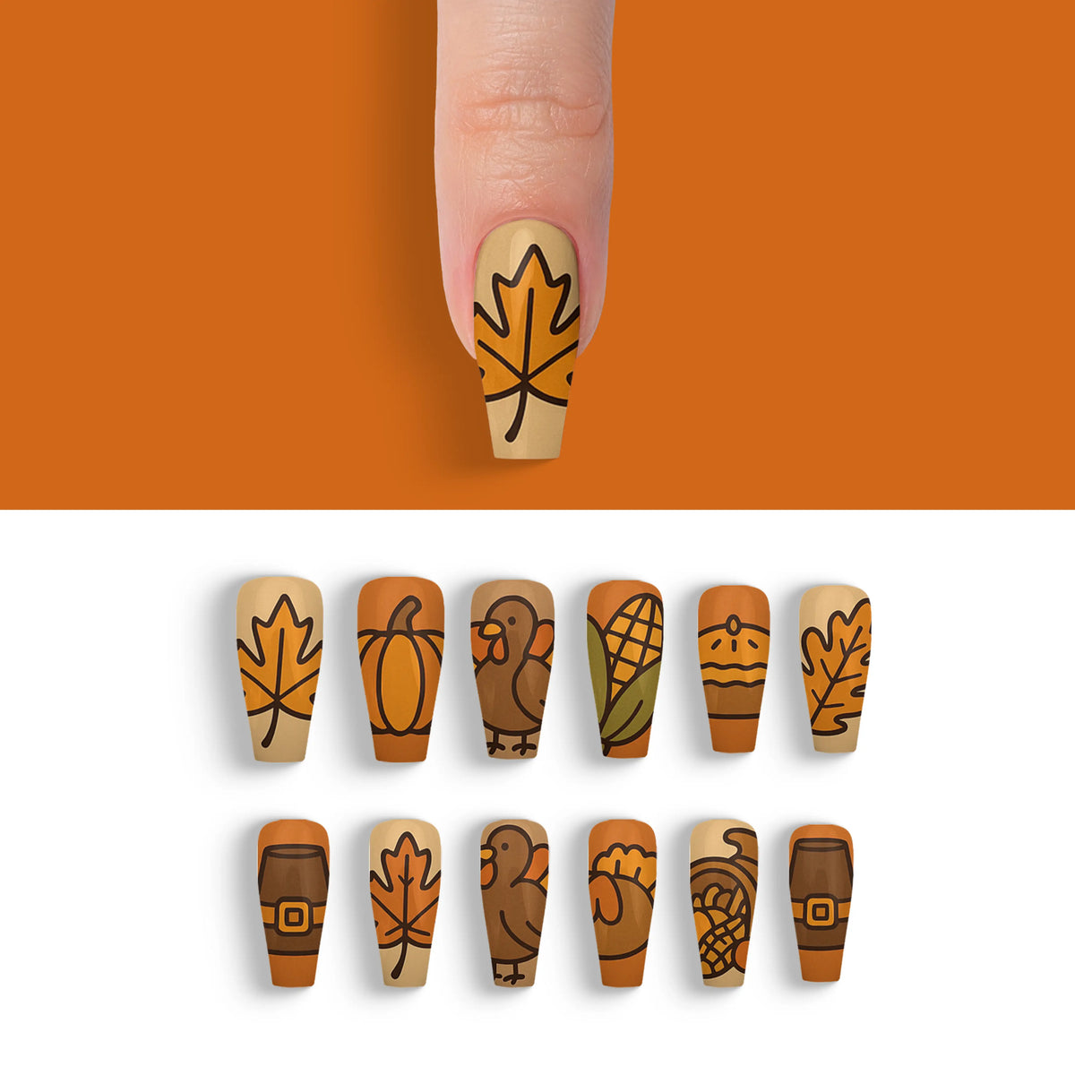 Step into subtle sophistication with our latest press-on nail collection, where classic beige hues beautifully capture the essence of Thanksgiving. These nails showcase a medley of turkey-themed accents paired with chic neutrals, creating a refined, autumn-inspired appearance. Ideal for any festive gathering, enjoy a salon-quality finish and effortless application, all without stepping out of your home. Plus, their robust and reusable designs let you relish the season's charm repeatedly.