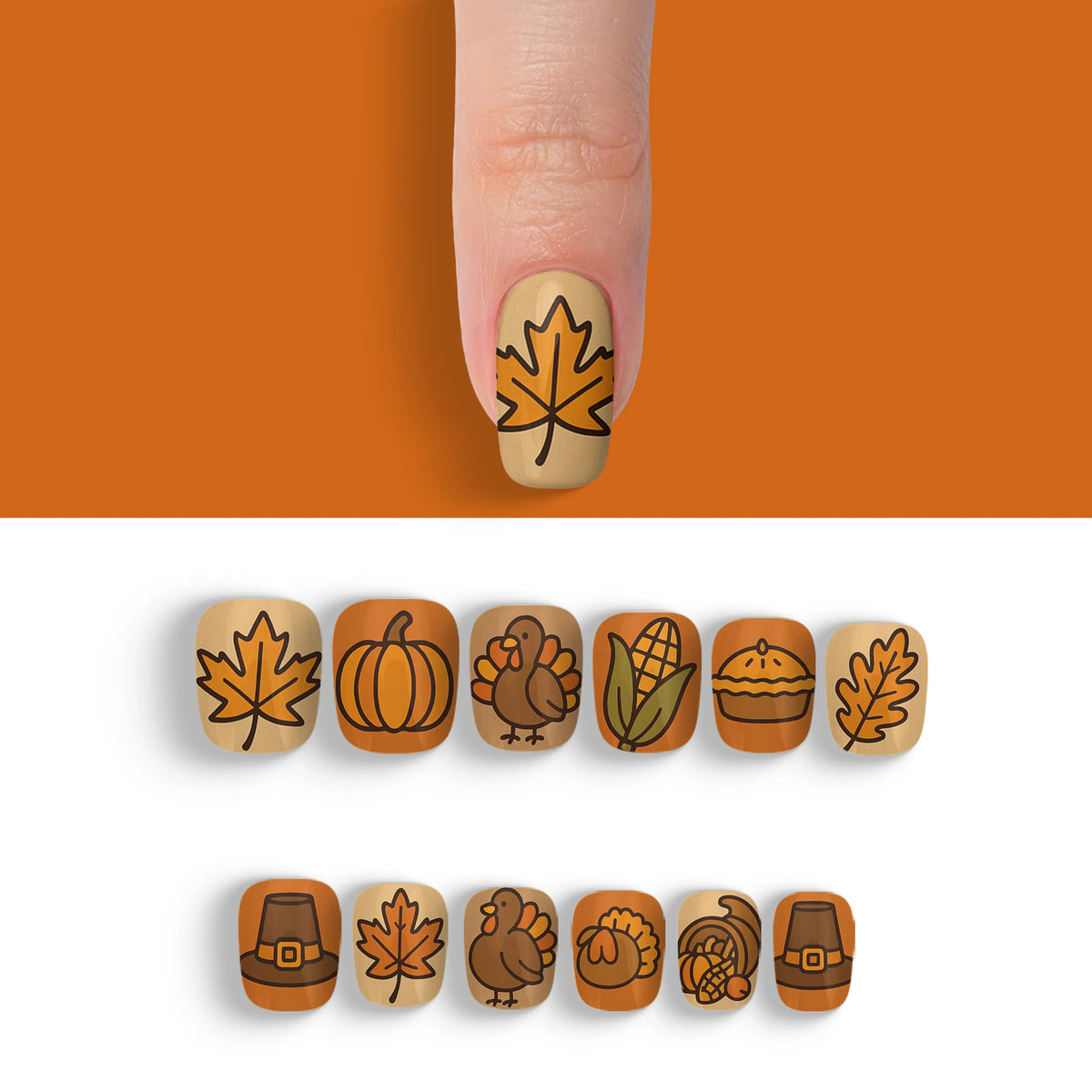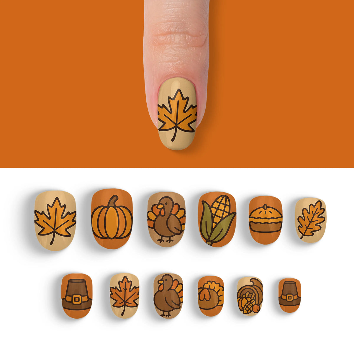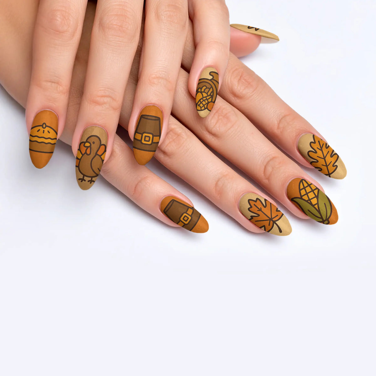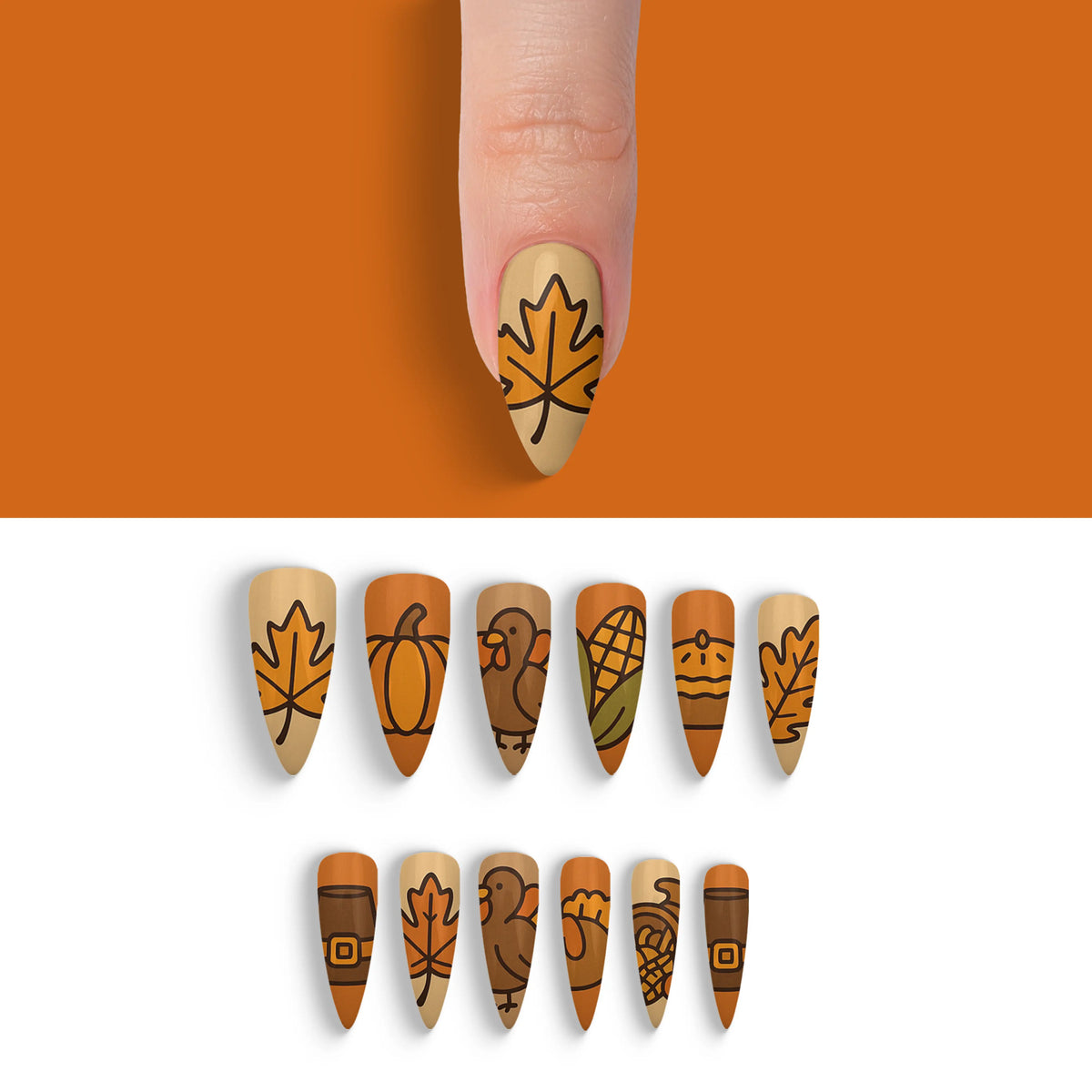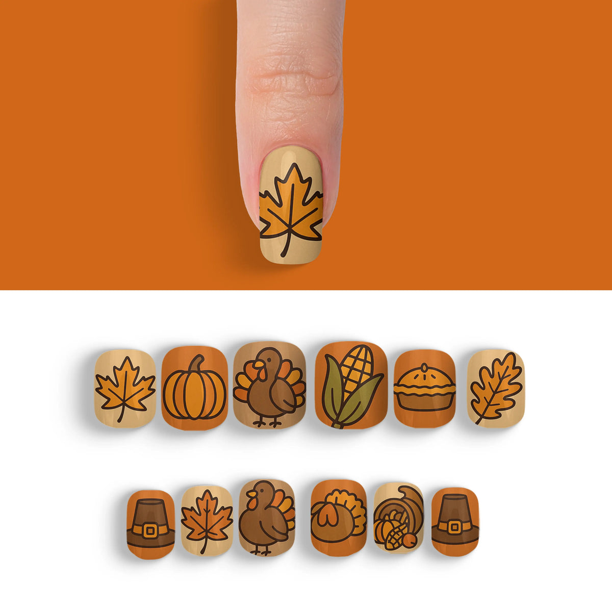 Step into subtle sophistication with our latest press-on nail collection, where classic beige hues beautifully capture the essence of Thanksgiving. These nails showcase a medley of turkey-themed accents paired with chic neutrals, creating a refined, autumn-inspired appearance. Ideal for any festive gathering, enjoy a salon-quality finish and effortless application, all without stepping out of your home. Plus, their robust and reusable designs let you relish the season's charm repeatedly.