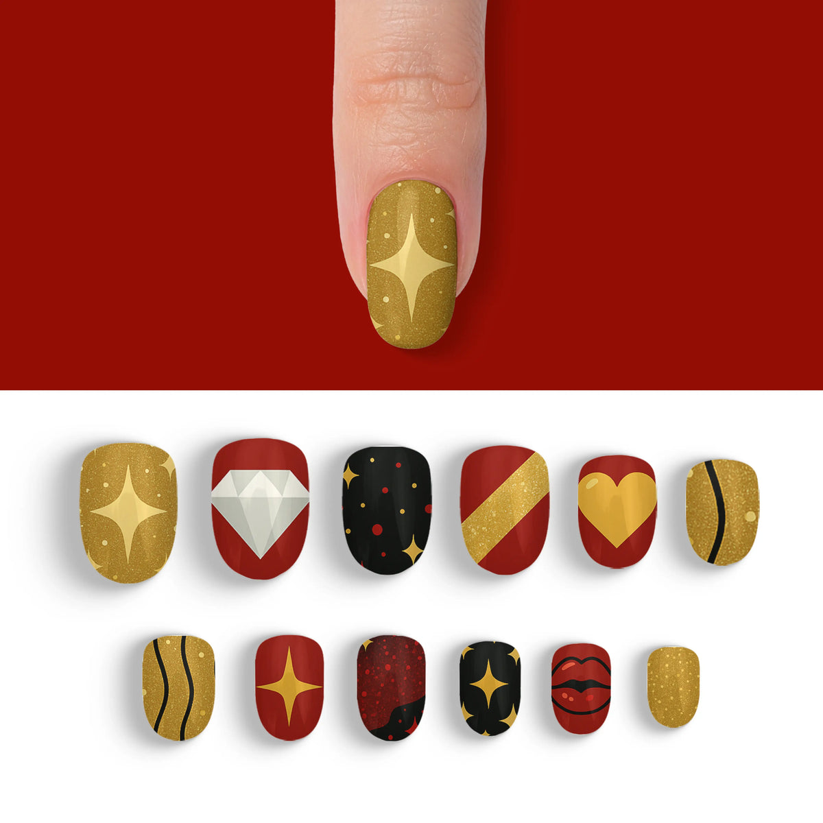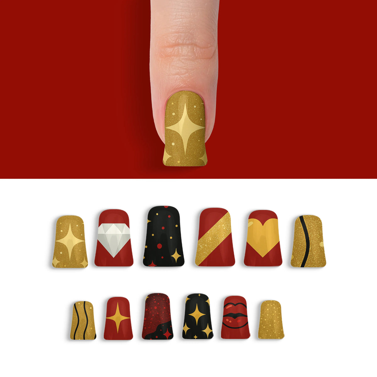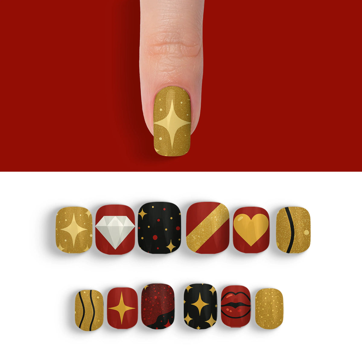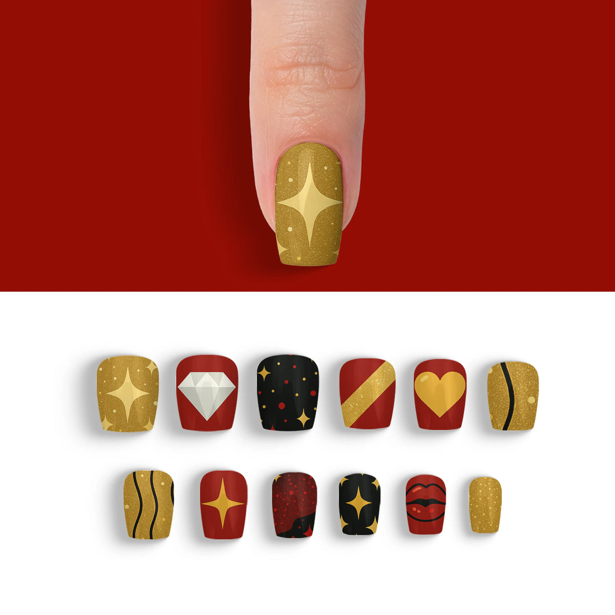 Includes 24 custom printed nails, nail file, cuticle stick, jelly tabs, glue & instructions