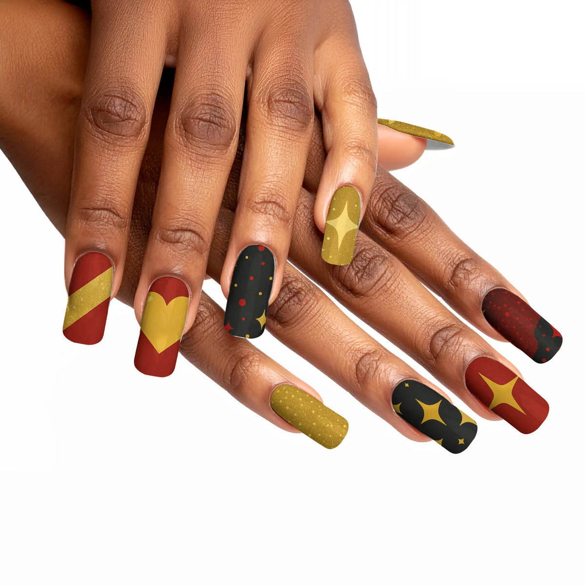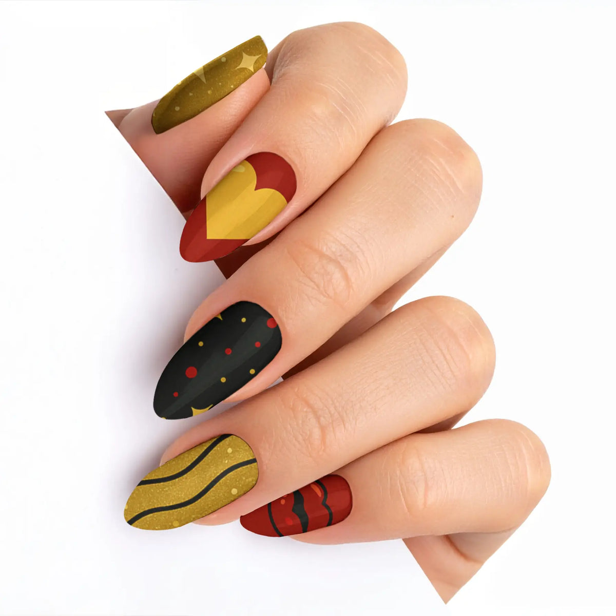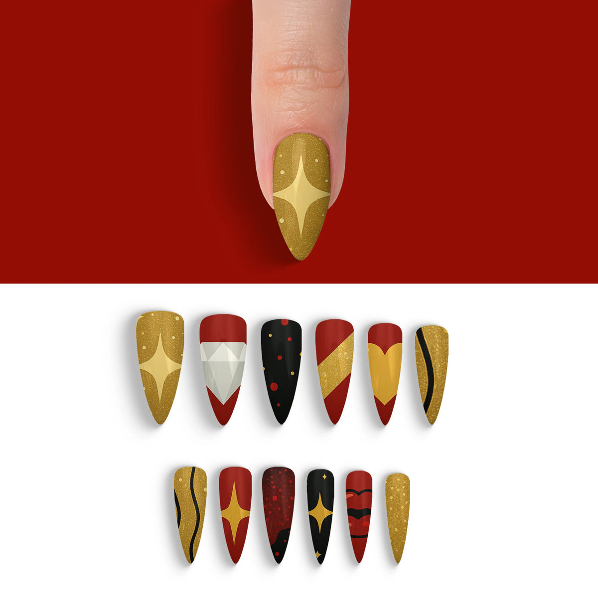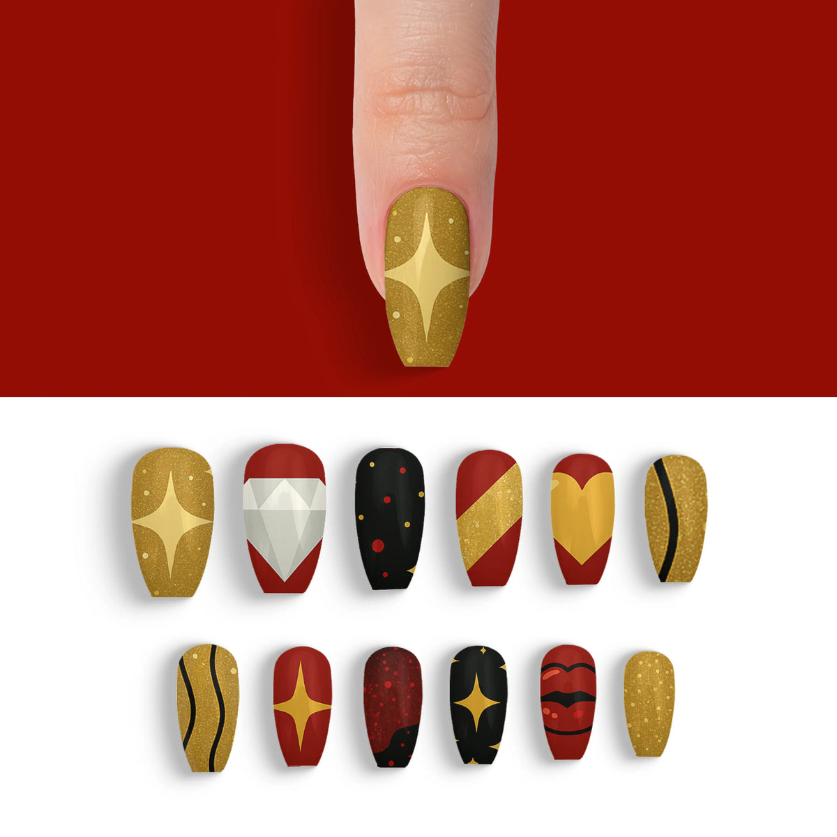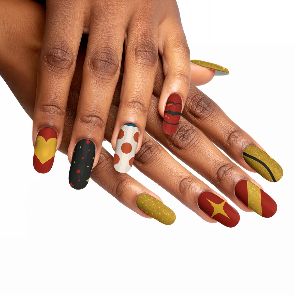 Includes 24 custom printed nails, nail file, cuticle stick, jelly tabs, glue & instructions