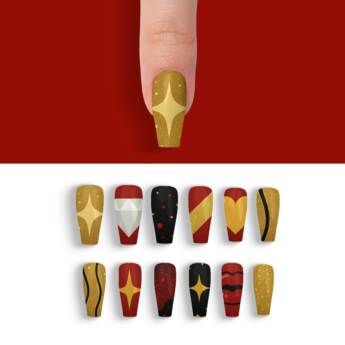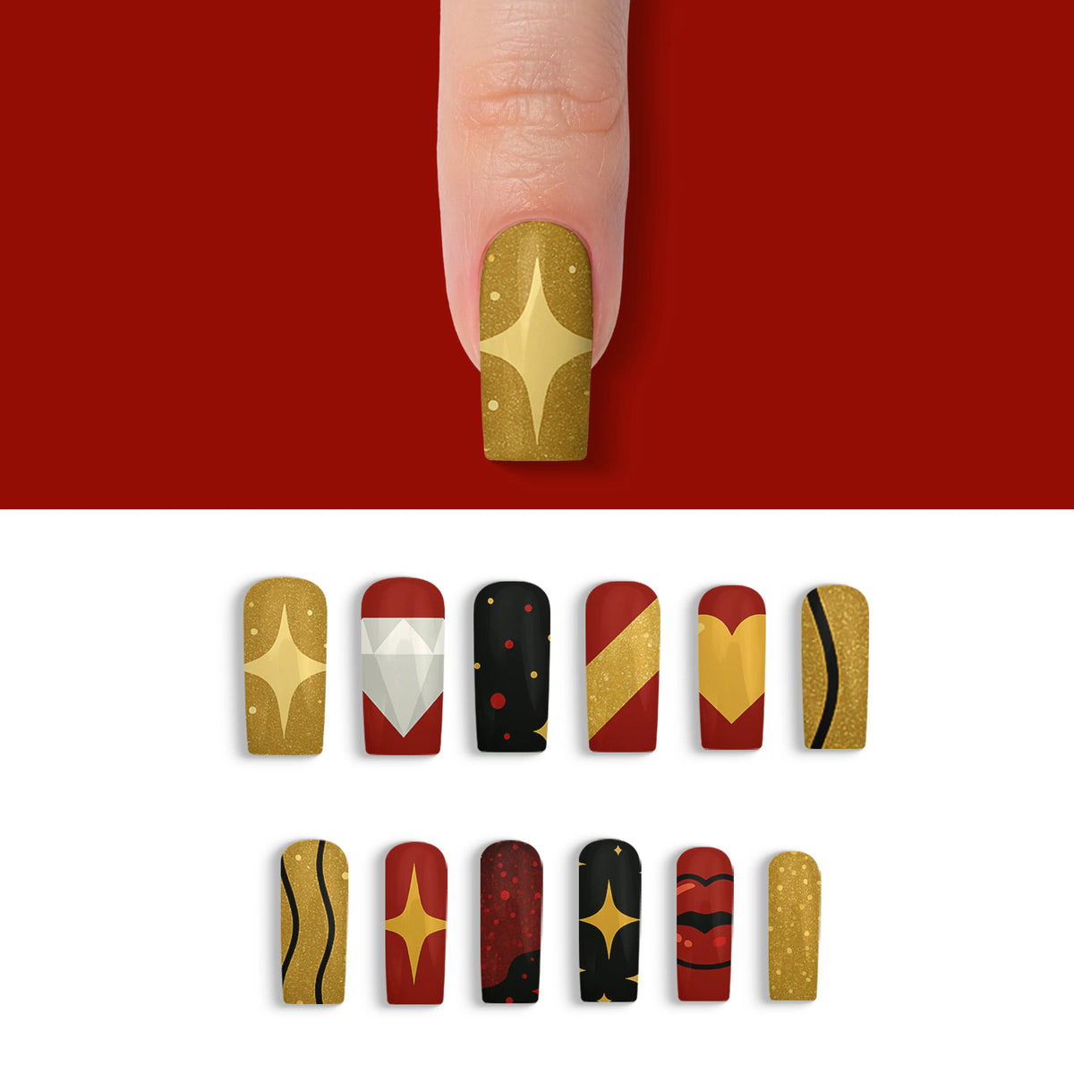 What’s inside: 24 nails in multiple sizes (12 designs, 2 of each design), adhesive tabs, nail glue, a prep kit (cleanser pad, mini file, cuticle stick), and simple step-by-step instructions.