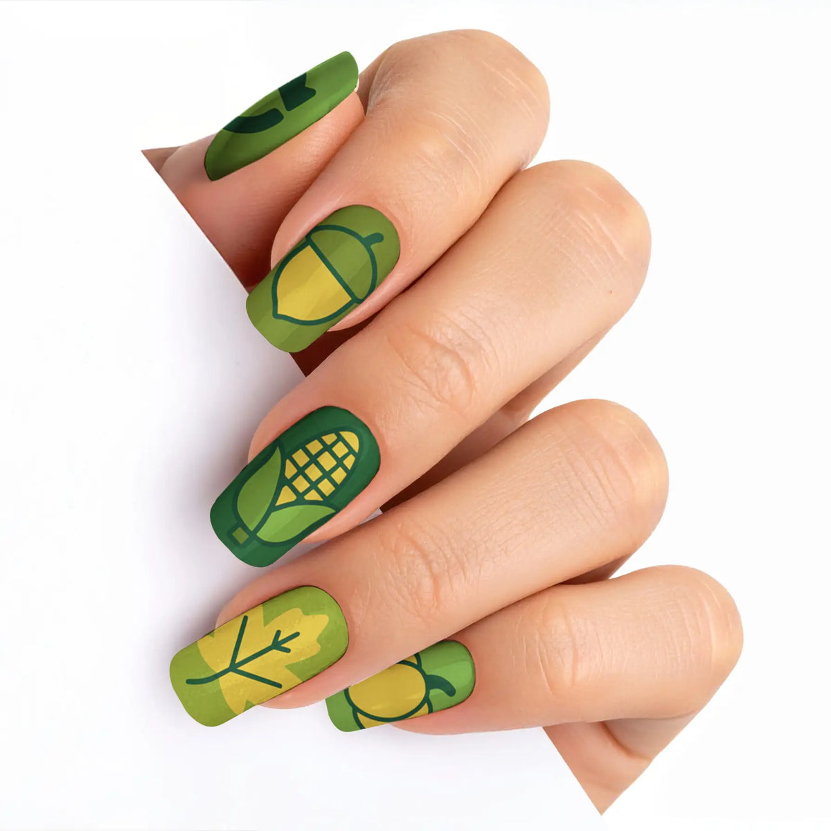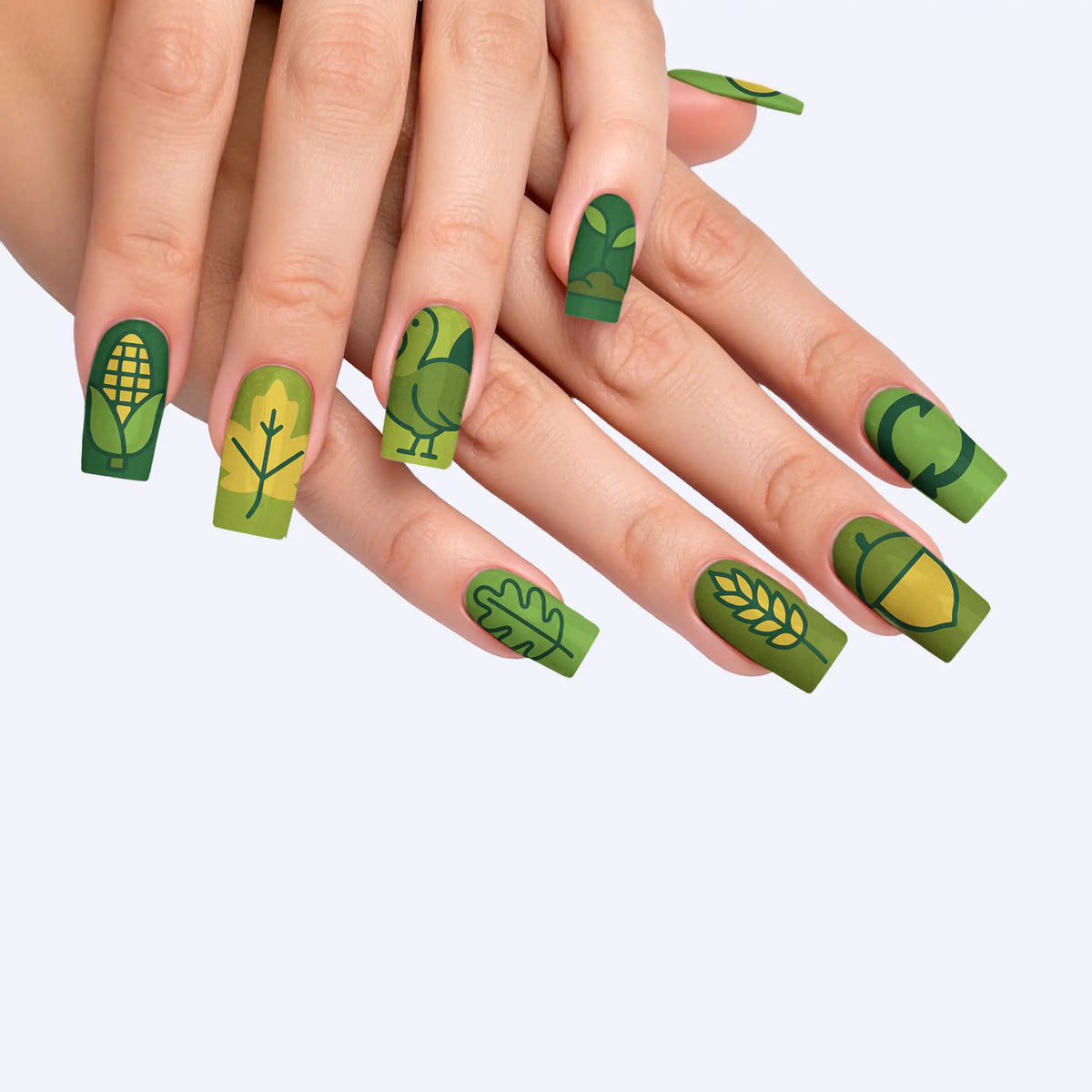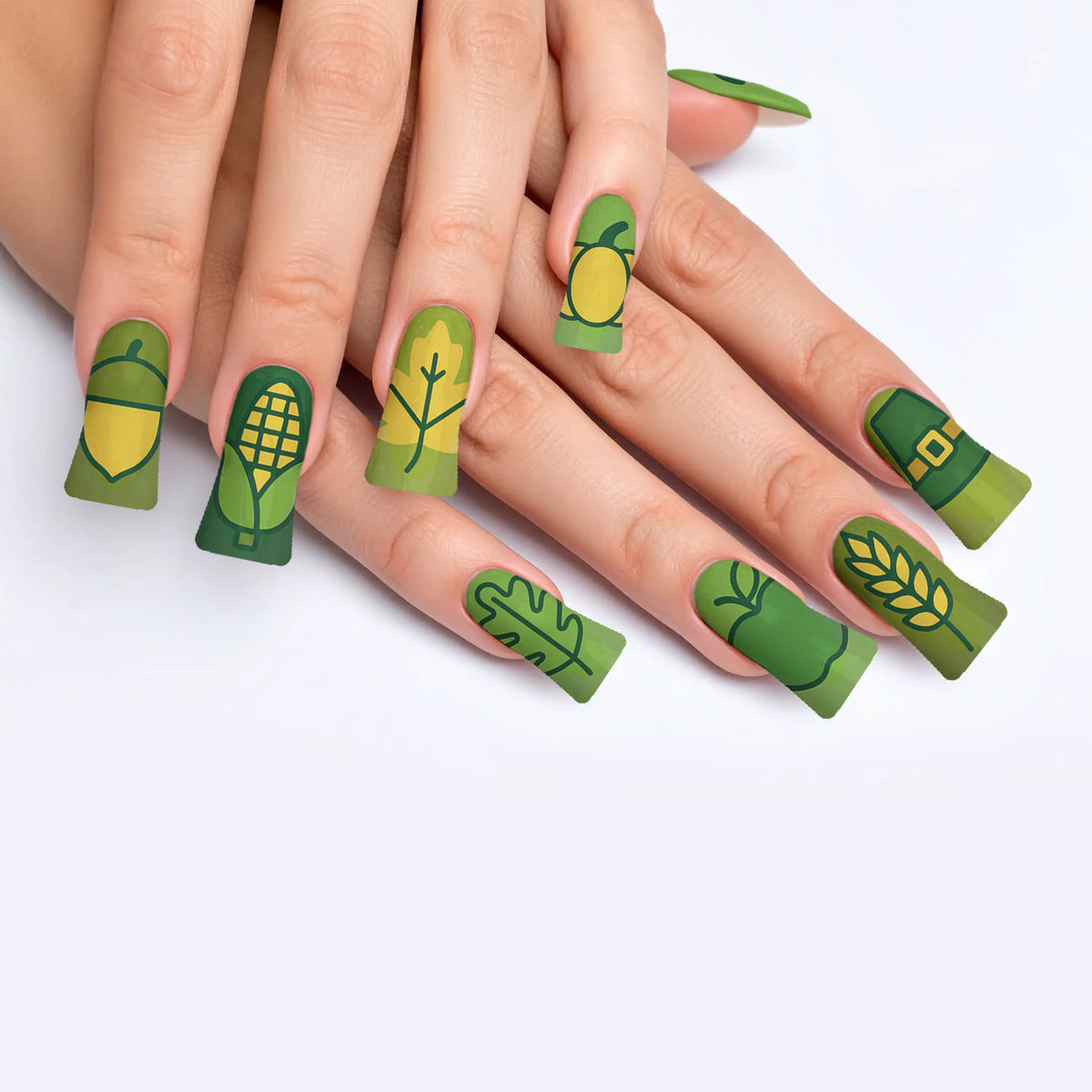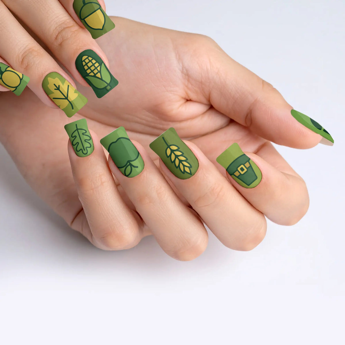 Step into a world where nature's beauty meets your fingertips with this Verdant Harvest collection, the perfect addition to your Thanksgiving celebrations. These press-on nails capture the lush tones of a green autumn, exuding elegance and a touch of whimsy. Each design echoes the season's charm, ensuring your nails mirror the splendor of fall foliage. Crafted for effortless style and resilience, these salon-quality nails provide a flawless finish without the salon visit.
