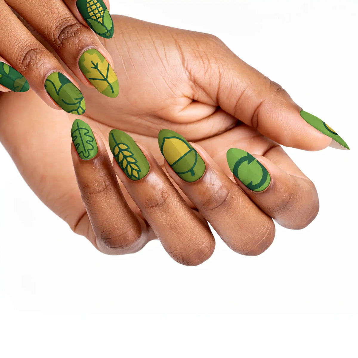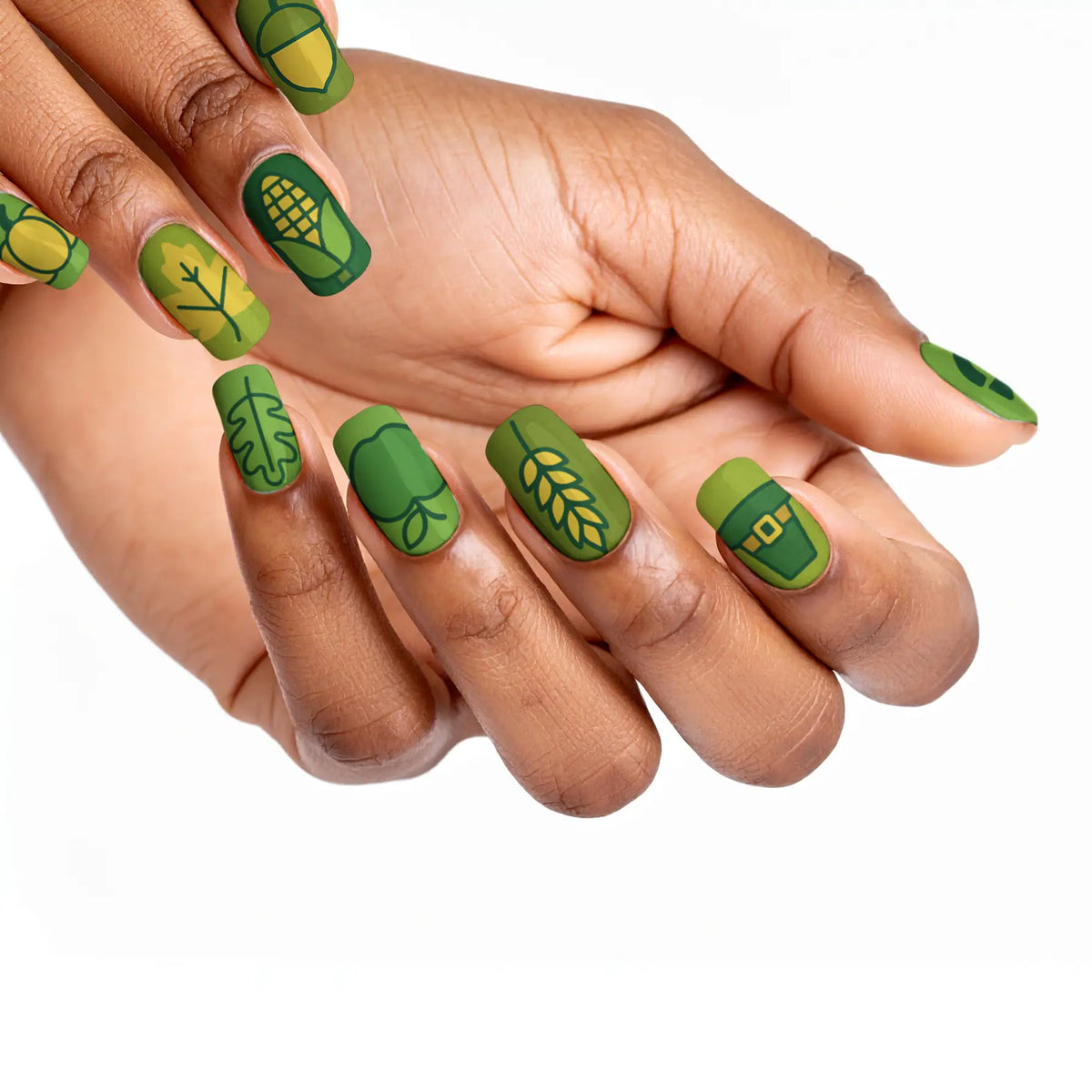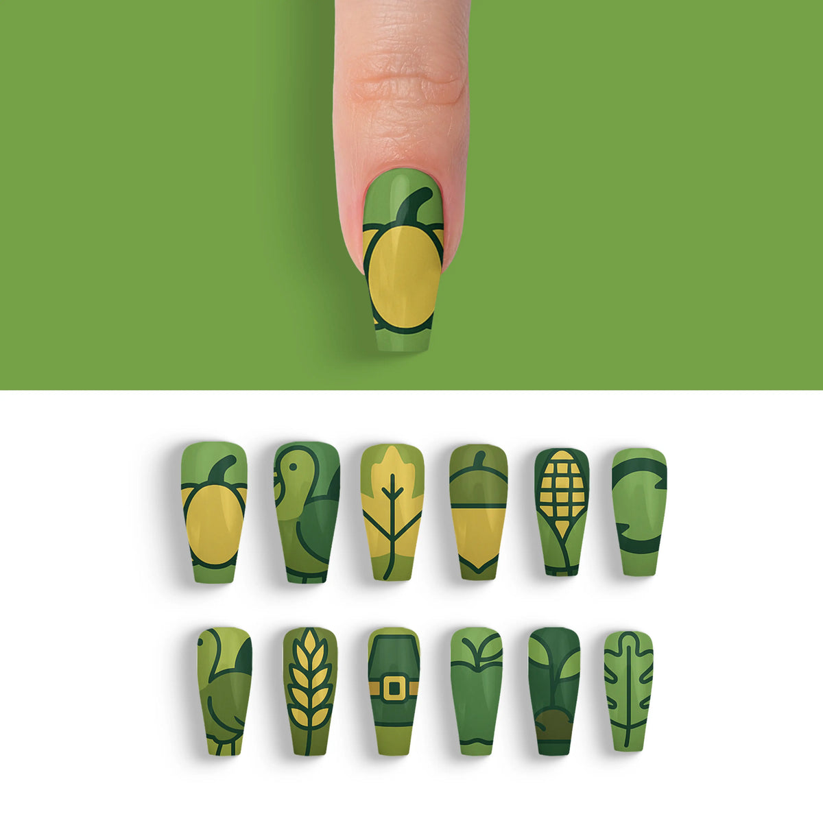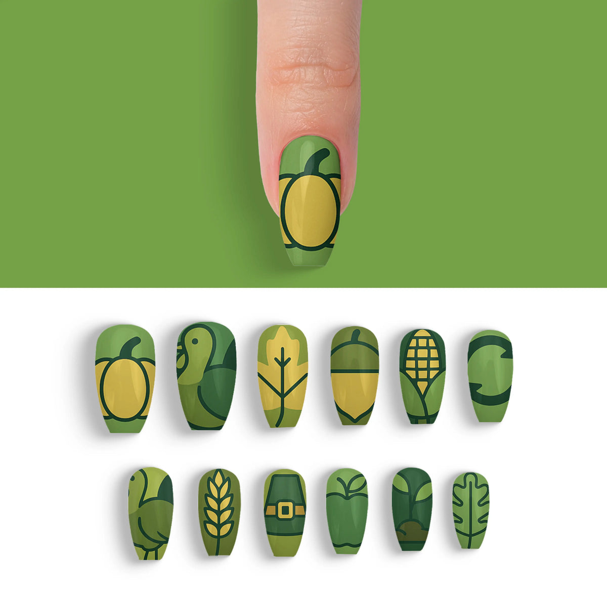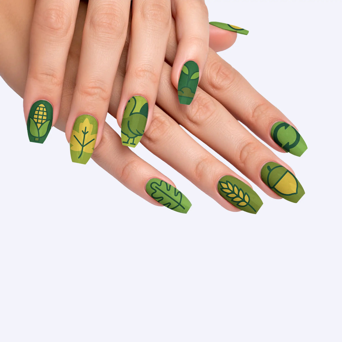 Step into a world where nature's beauty meets your fingertips with this Verdant Harvest collection, the perfect addition to your Thanksgiving celebrations. These press-on nails capture the lush tones of a green autumn, exuding elegance and a touch of whimsy. Each design echoes the season's charm, ensuring your nails mirror the splendor of fall foliage. Crafted for effortless style and resilience, these salon-quality nails provide a flawless finish without the salon visit.