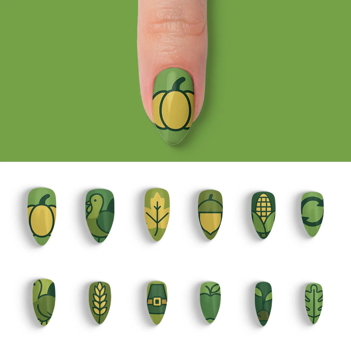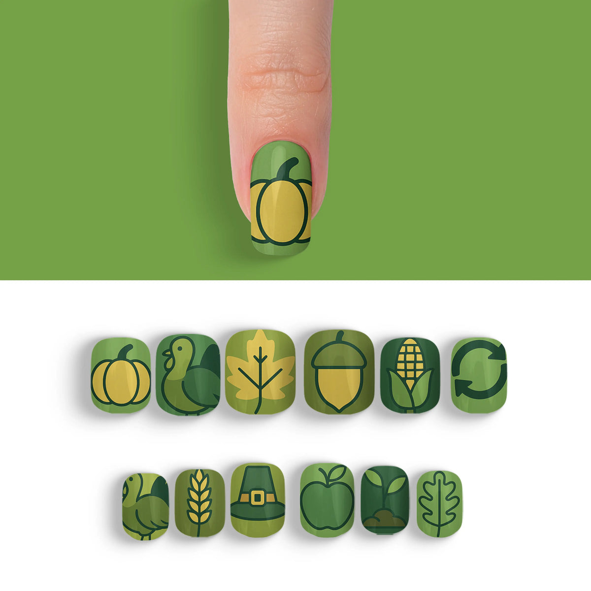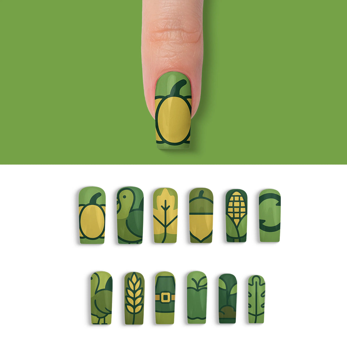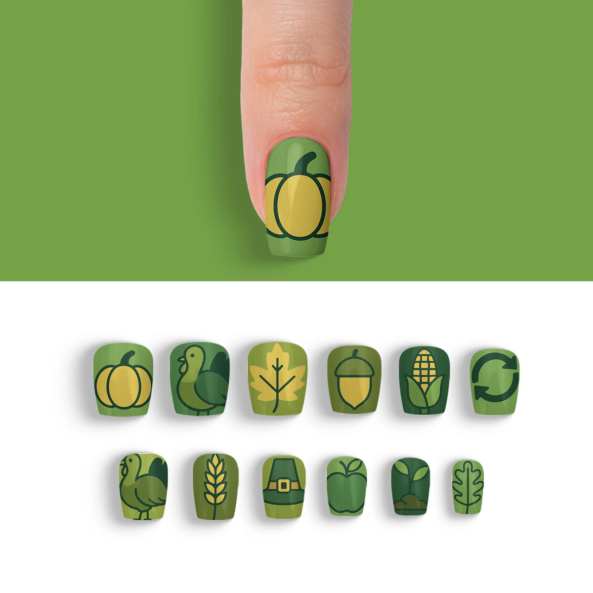 Step into a world where nature's beauty meets your fingertips with this Verdant Harvest collection, the perfect addition to your Thanksgiving celebrations. These press-on nails capture the lush tones of a green autumn, exuding elegance and a touch of whimsy. Each design echoes the season's charm, ensuring your nails mirror the splendor of fall foliage. Crafted for effortless style and resilience, these salon-quality nails provide a flawless finish without the salon visit.