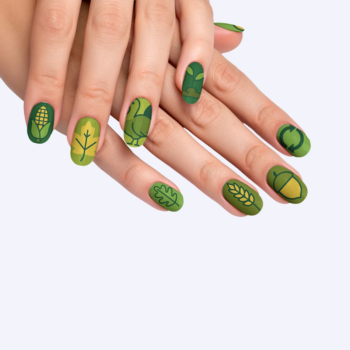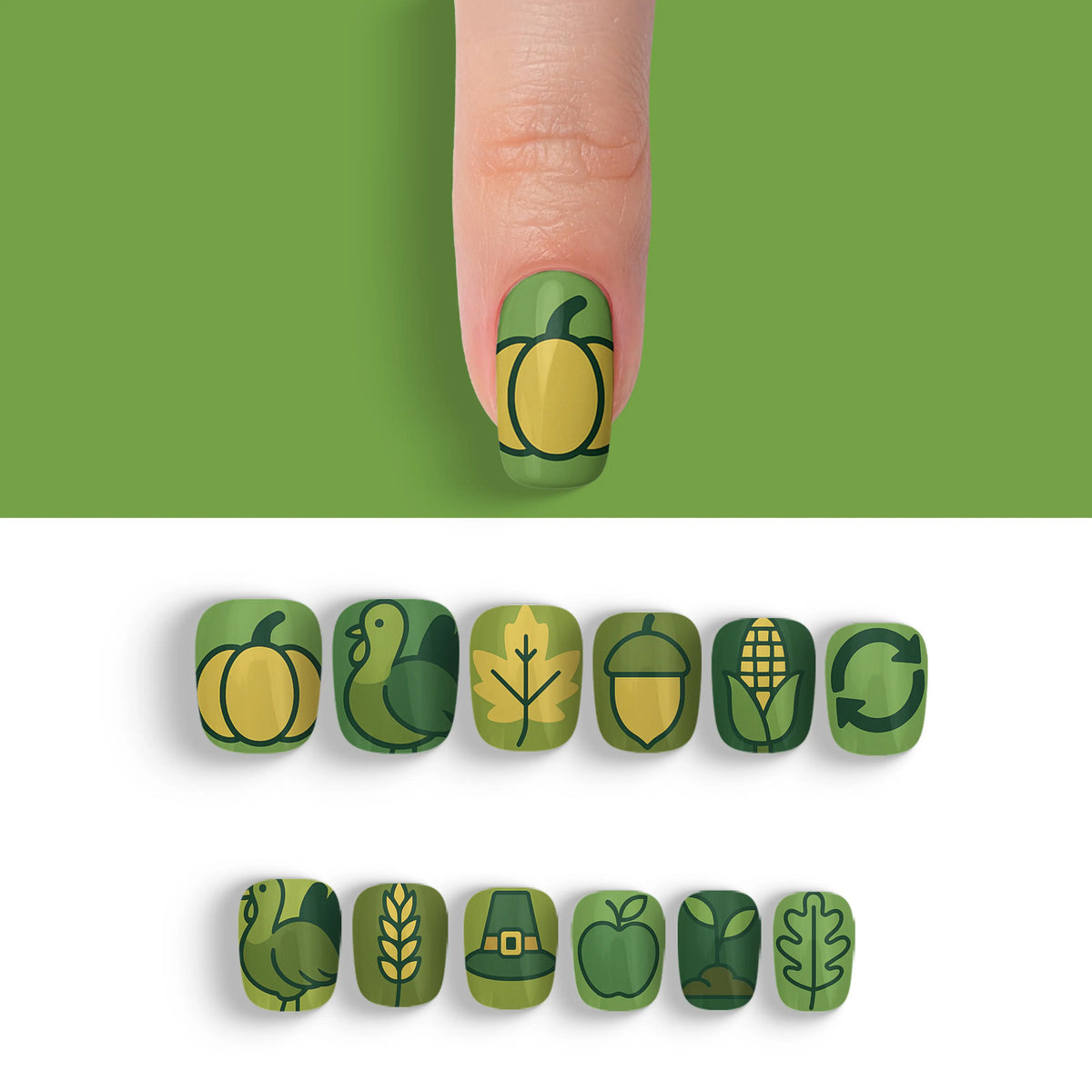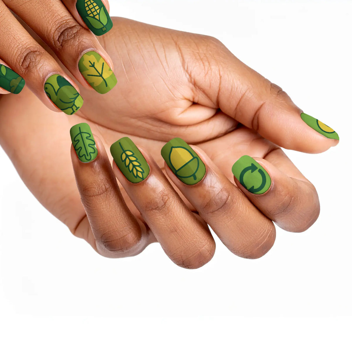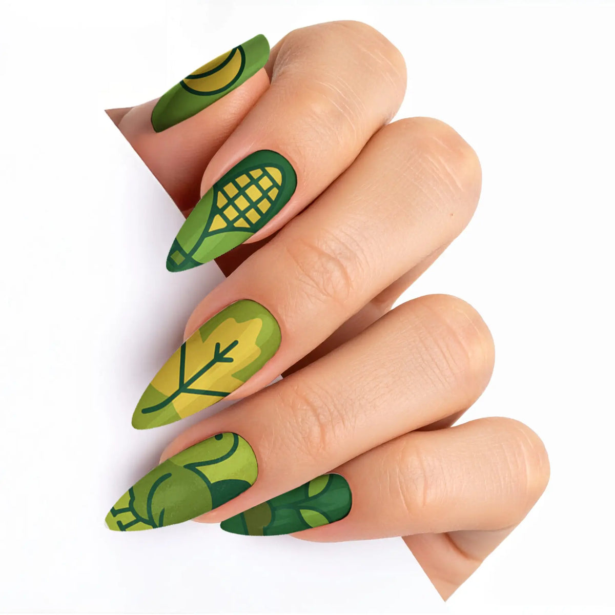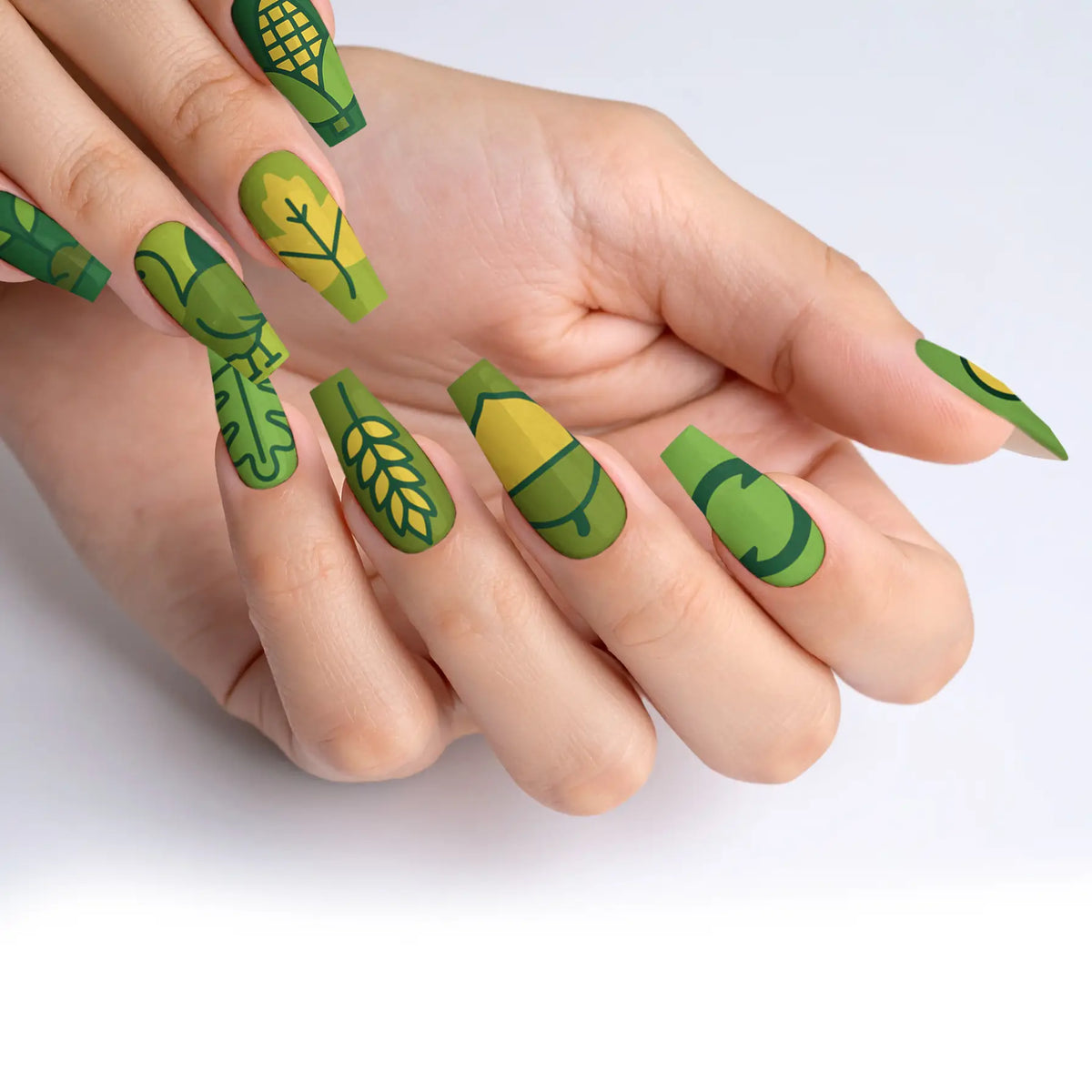Step into a world where nature's beauty meets your fingertips with this Verdant Harvest collection, the perfect addition to your Thanksgiving celebrations. These press-on nails capture the lush tones of a green autumn, exuding elegance and a touch of whimsy. Each design echoes the season's charm, ensuring your nails mirror the splendor of fall foliage. Crafted for effortless style and resilience, these salon-quality nails provide a flawless finish without the salon visit.