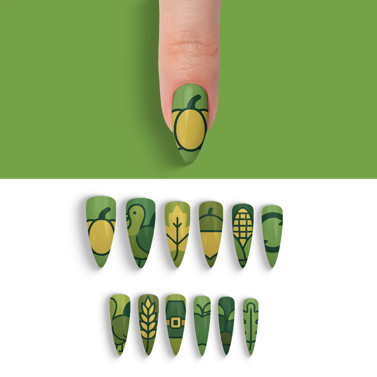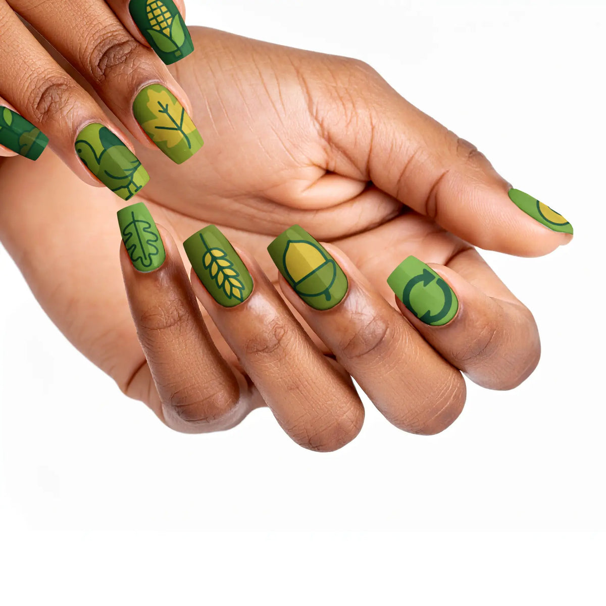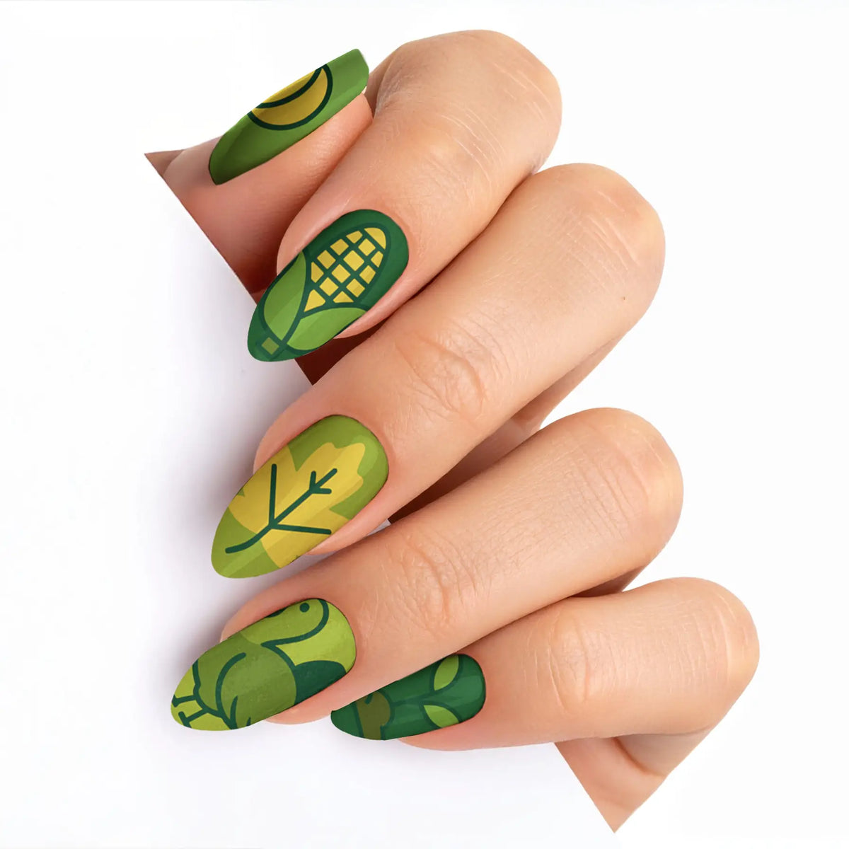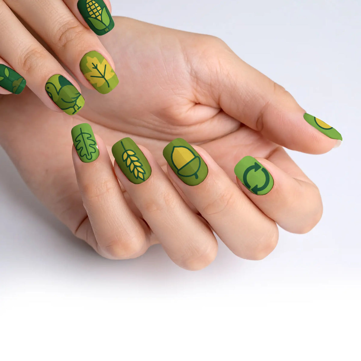 Step into a world where nature's beauty meets your fingertips with this Verdant Harvest collection, the perfect addition to your Thanksgiving celebrations. These press-on nails capture the lush tones of a green autumn, exuding elegance and a touch of whimsy. Each design echoes the season's charm, ensuring your nails mirror the splendor of fall foliage. Crafted for effortless style and resilience, these salon-quality nails provide a flawless finish without the salon visit.