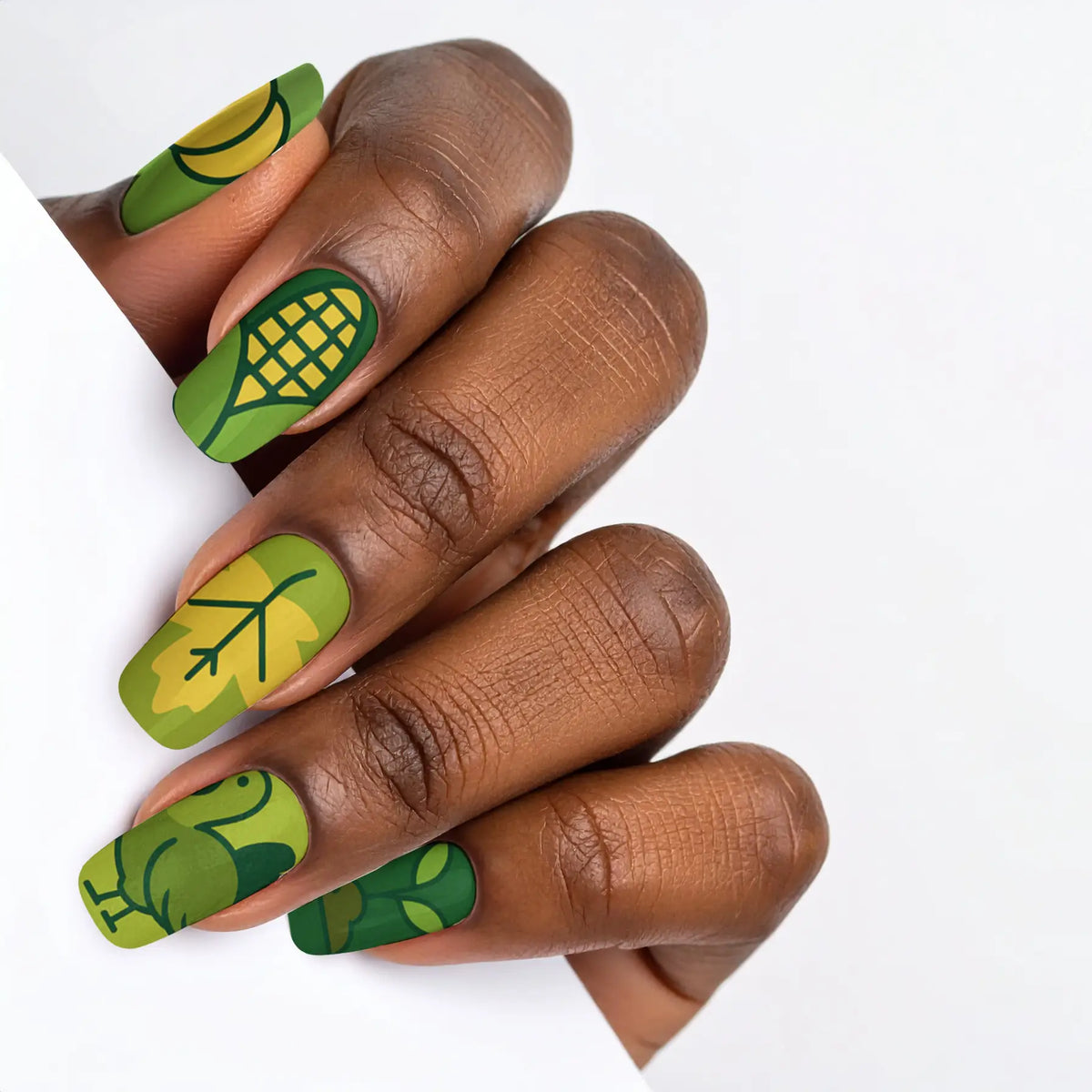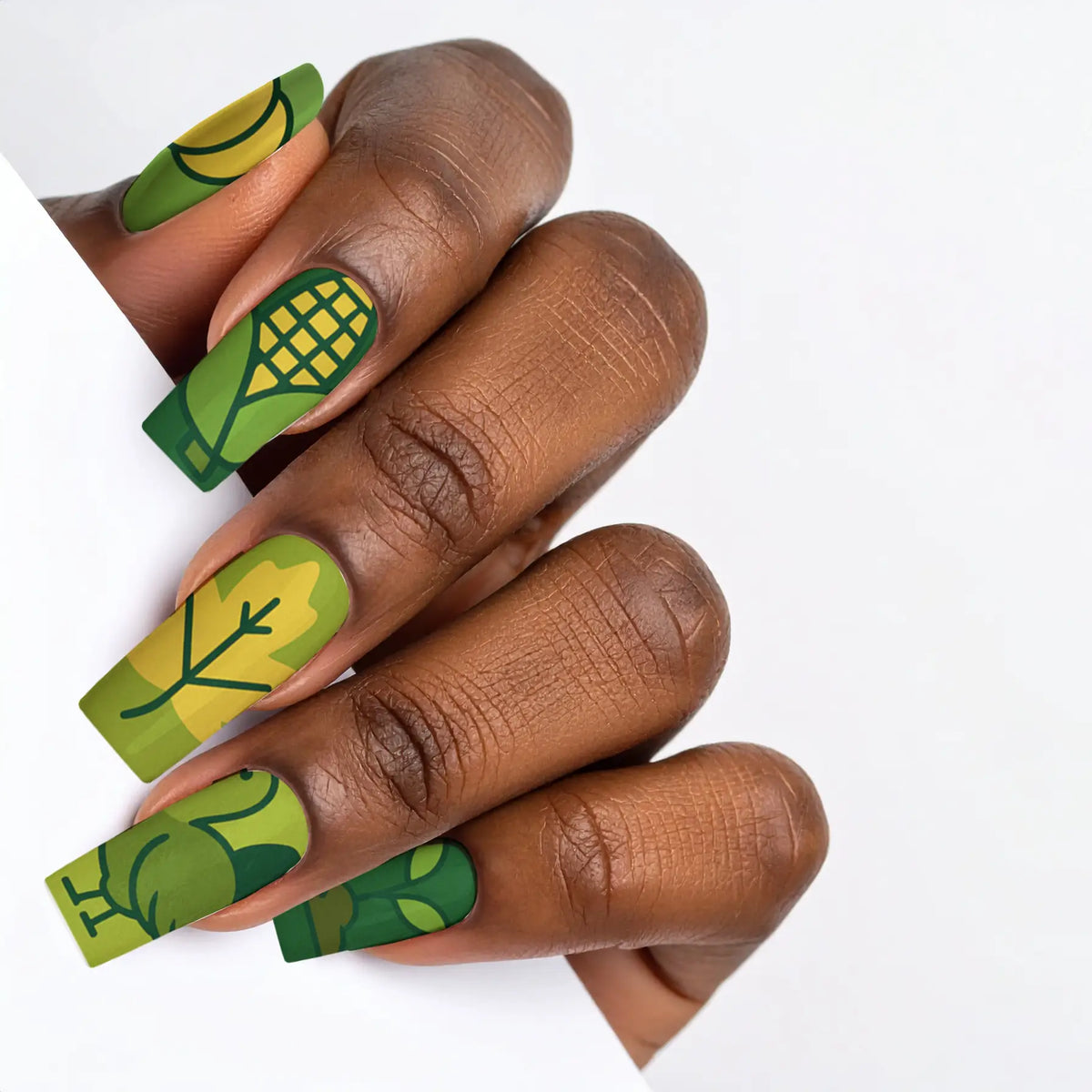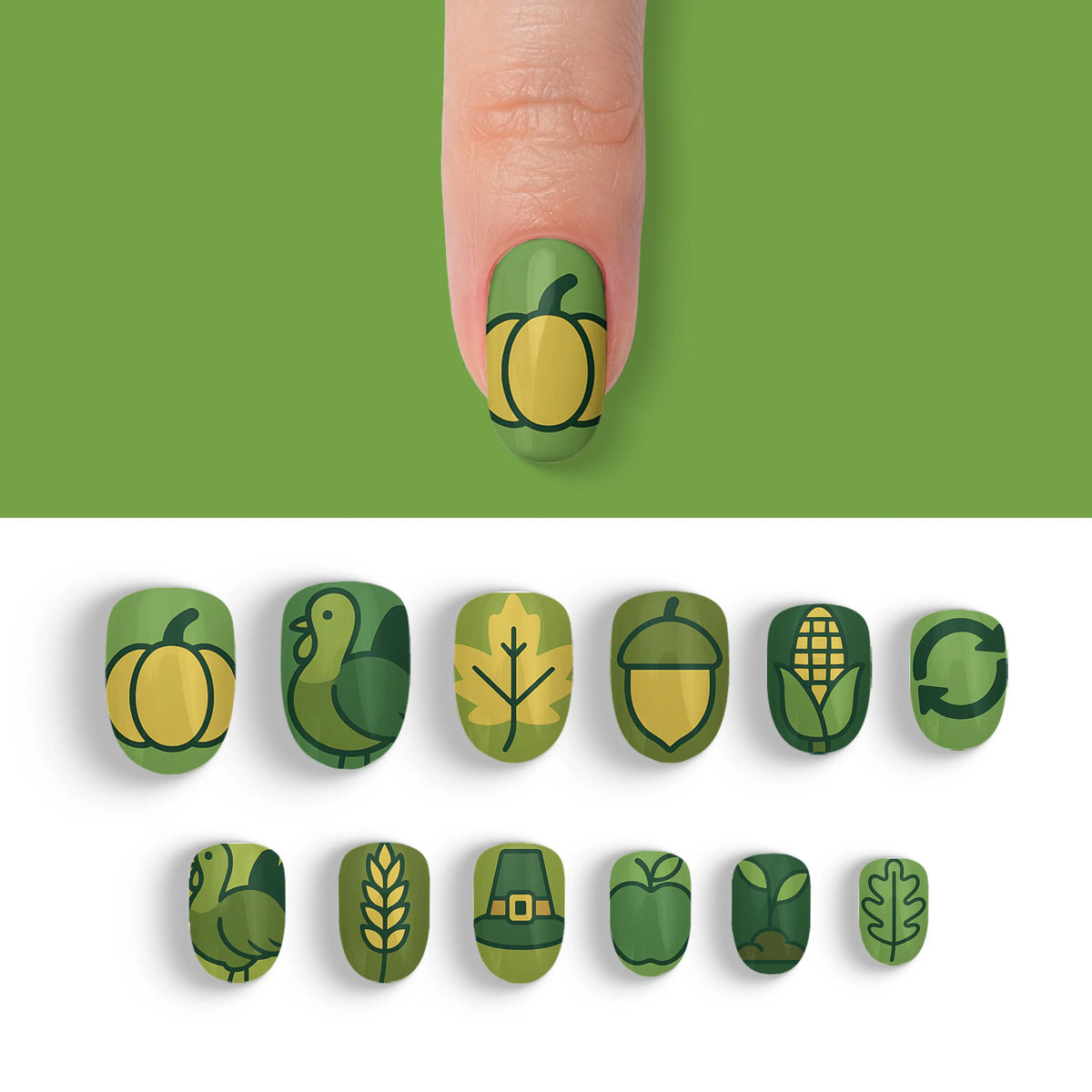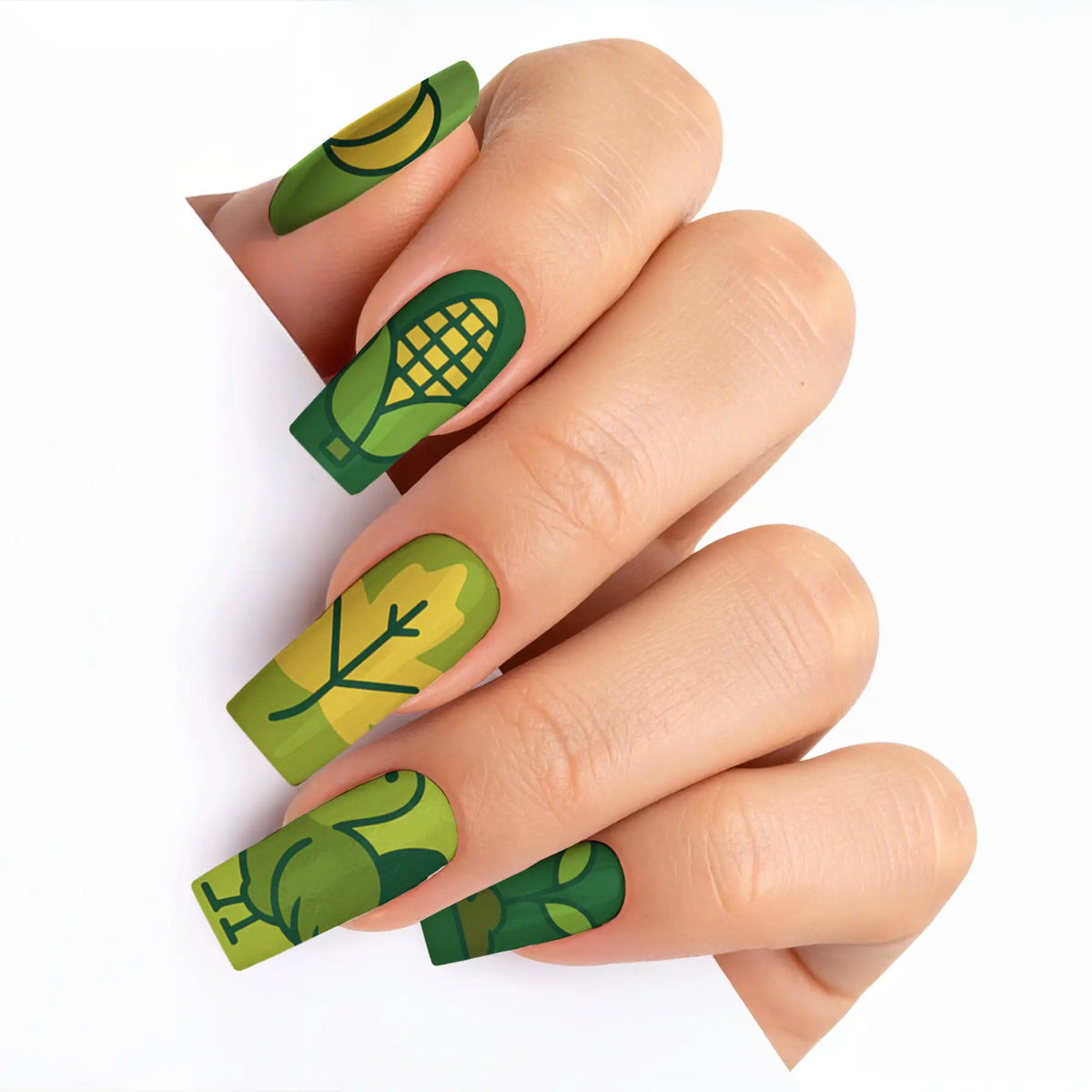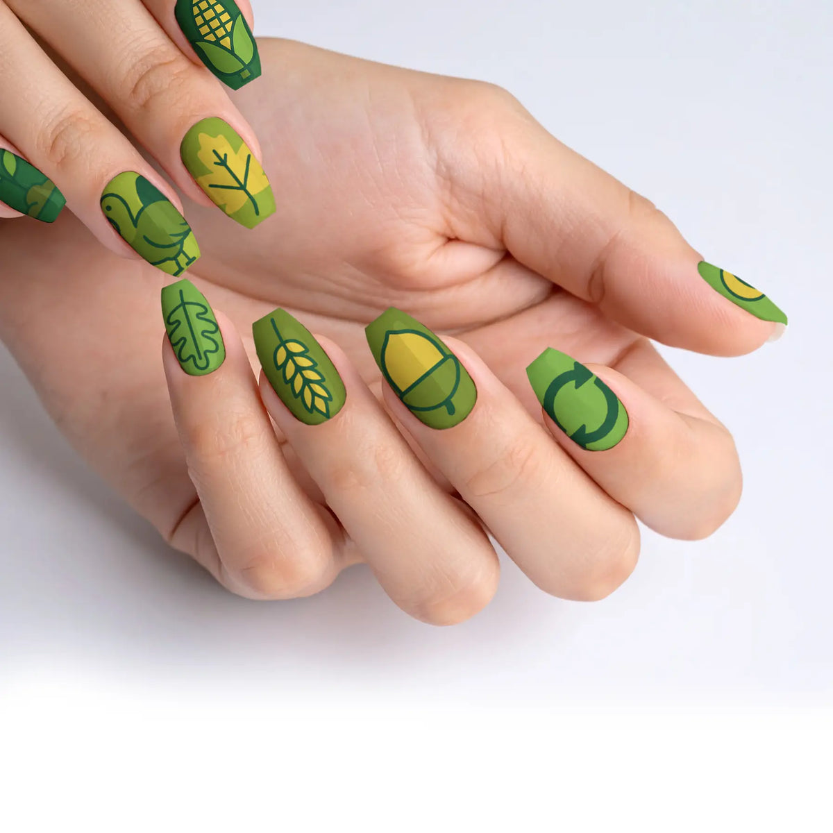 Step into a world where nature's beauty meets your fingertips with this Verdant Harvest collection, the perfect addition to your Thanksgiving celebrations. These press-on nails capture the lush tones of a green autumn, exuding elegance and a touch of whimsy. Each design echoes the season's charm, ensuring your nails mirror the splendor of fall foliage. Crafted for effortless style and resilience, these salon-quality nails provide a flawless finish without the salon visit.