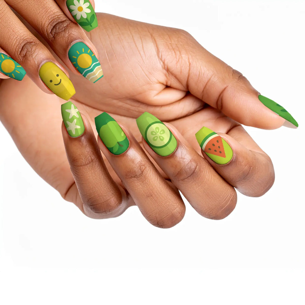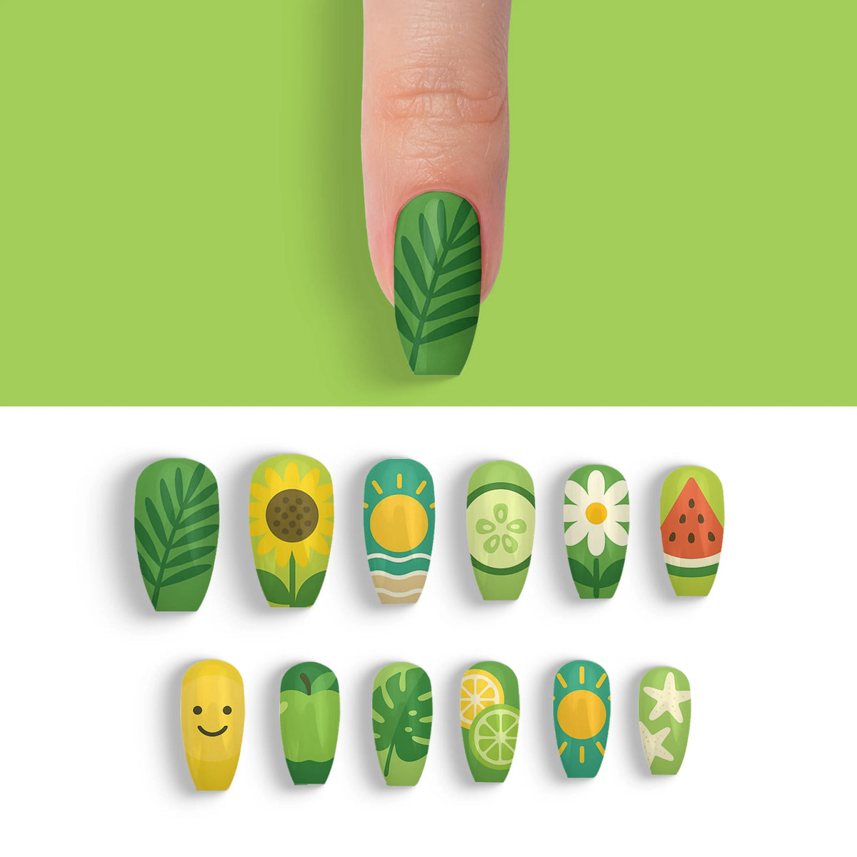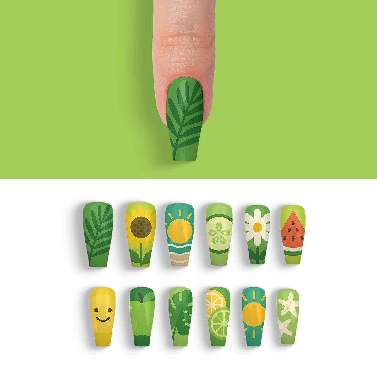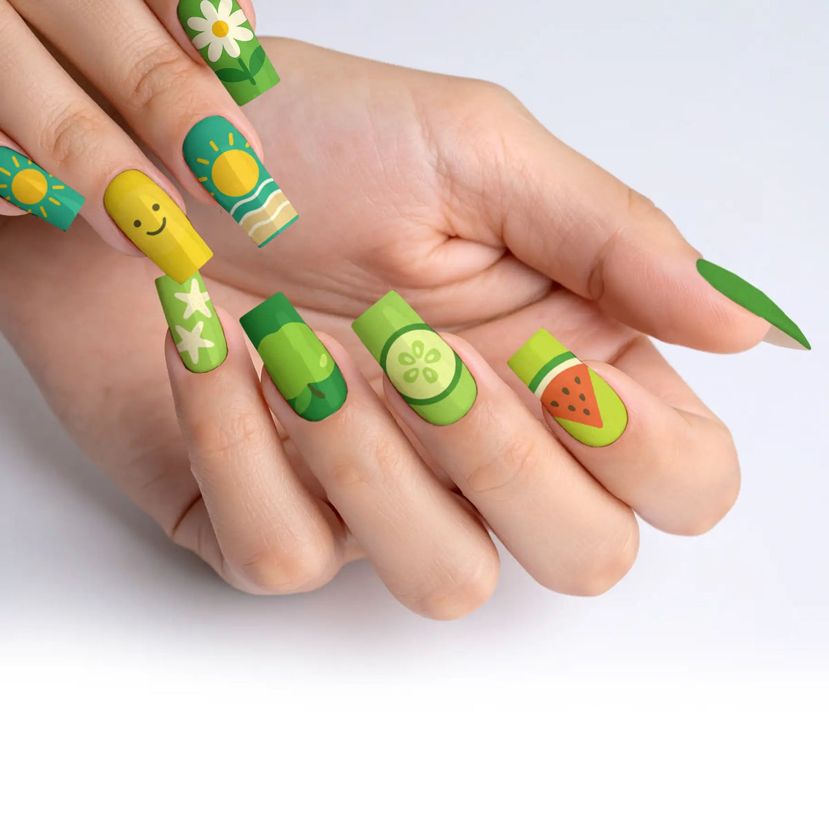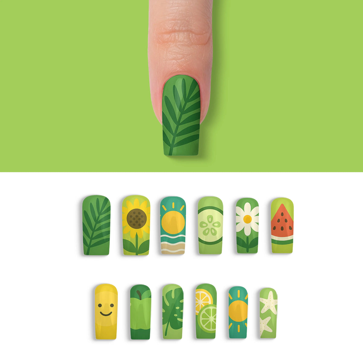 Step into a world where nature's vibrancy meets chic elegance with our Verdant Splash Greenery Vivacity Press-On Nails. This collection is your ticket to making a bold and refreshing statement, inspired by the lush beauty of nature's greens. Each set offers a seamless blend of style and sophistication, perfect for those who want to effortlessly capture attention. With a palette of refreshing green hues and 12 distinct designs, your nails will exude a fresh and modern flair, ideal for any occasion. Enjoy the convenience of a salon-quality finish right at home, with a simple application process that guarantees both durability and reusability.